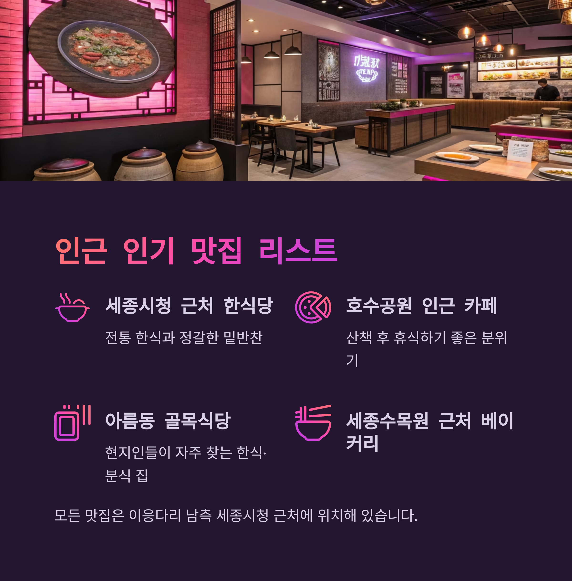 (위 맛집들은 이응다리 남측 세종시청 근처에 위치해 있습니다.)