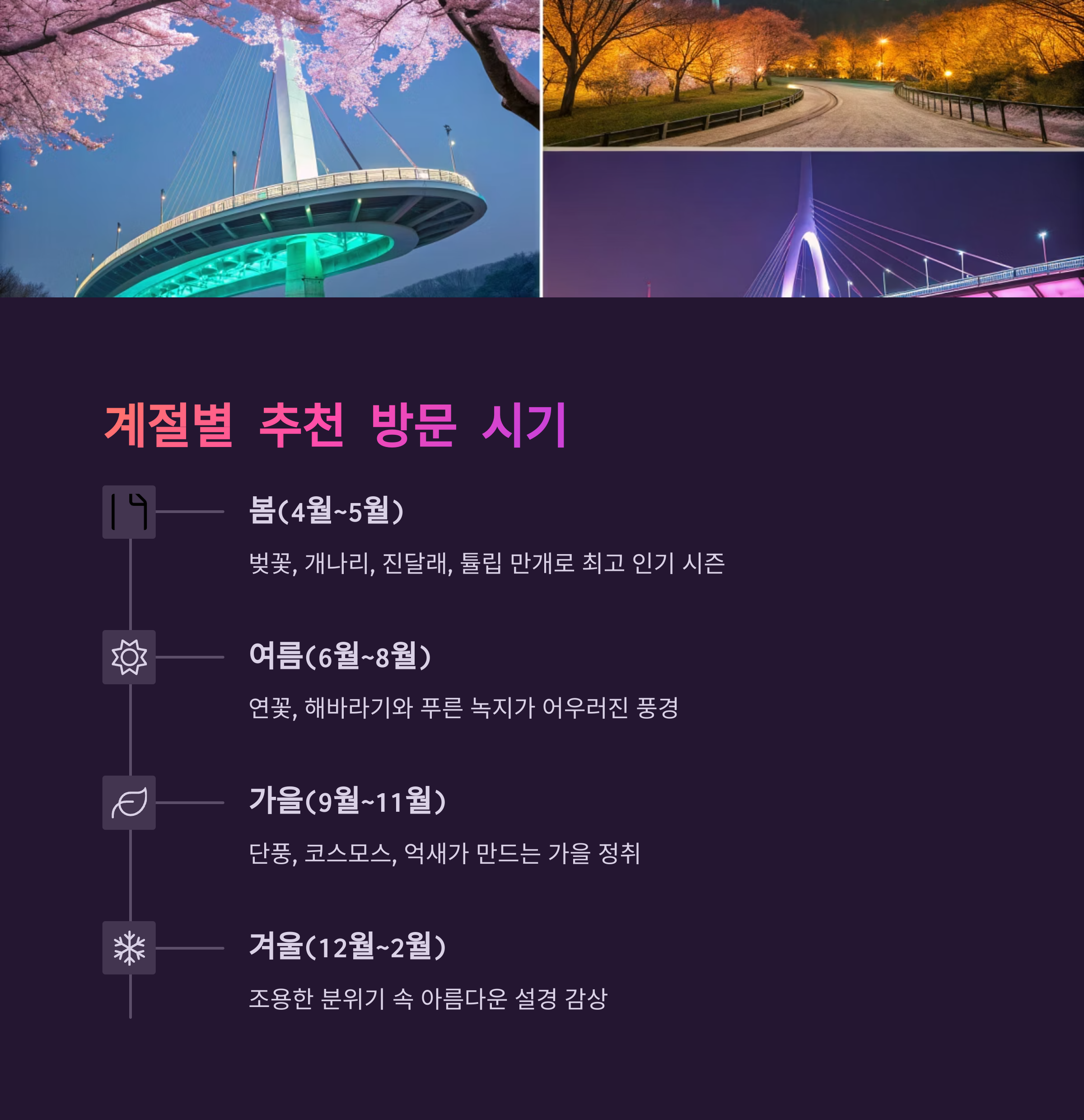 - 봄(4월~5월): 벚꽃, 개나리, 진달래, 튤립 등 봄꽃이 만개해 가장 인기 있는 계절이다.