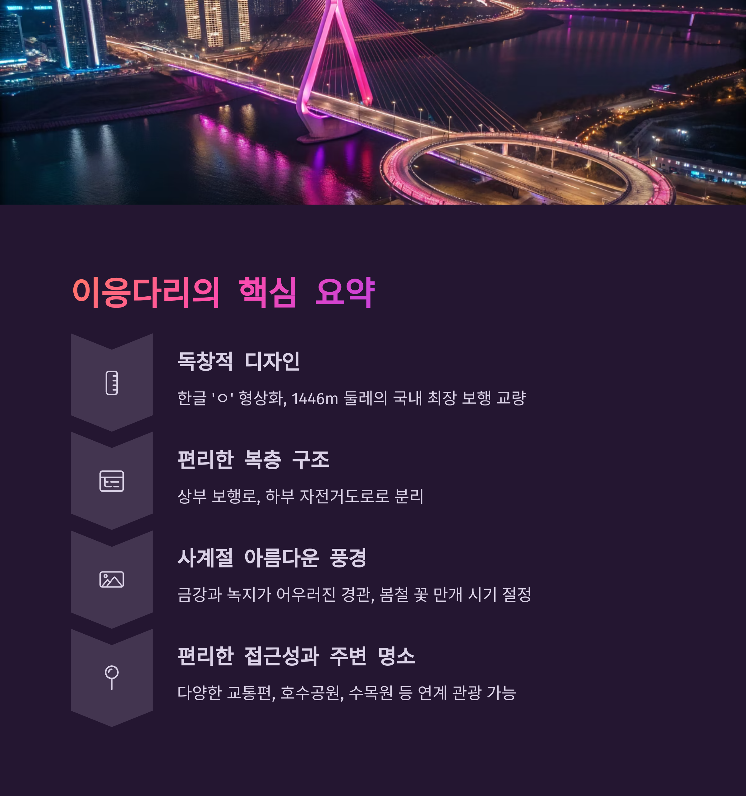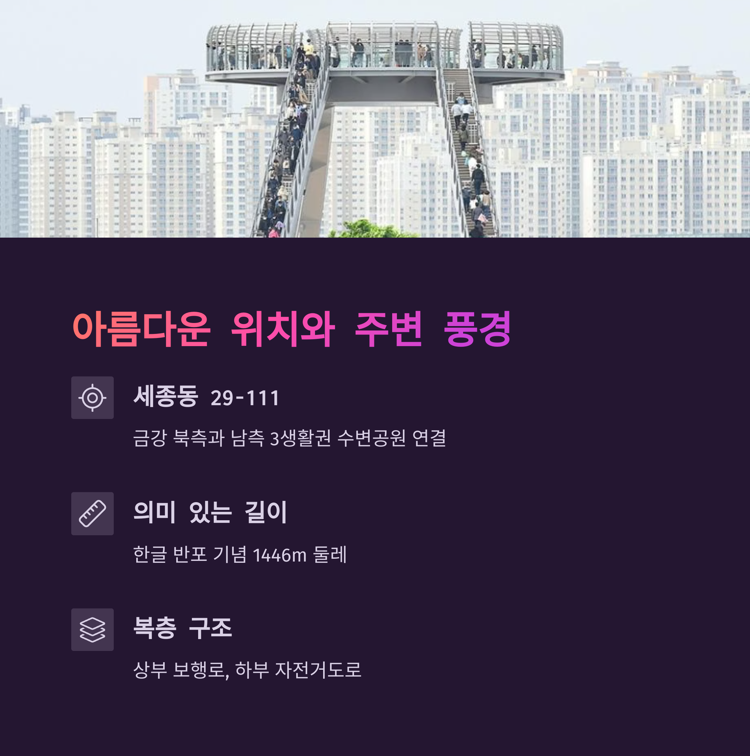 - 독창적인 디자인: 한글 'ㅇ'을 형상화한 둘레 1446m의 국내 최장 보행 전용 교량입니다.