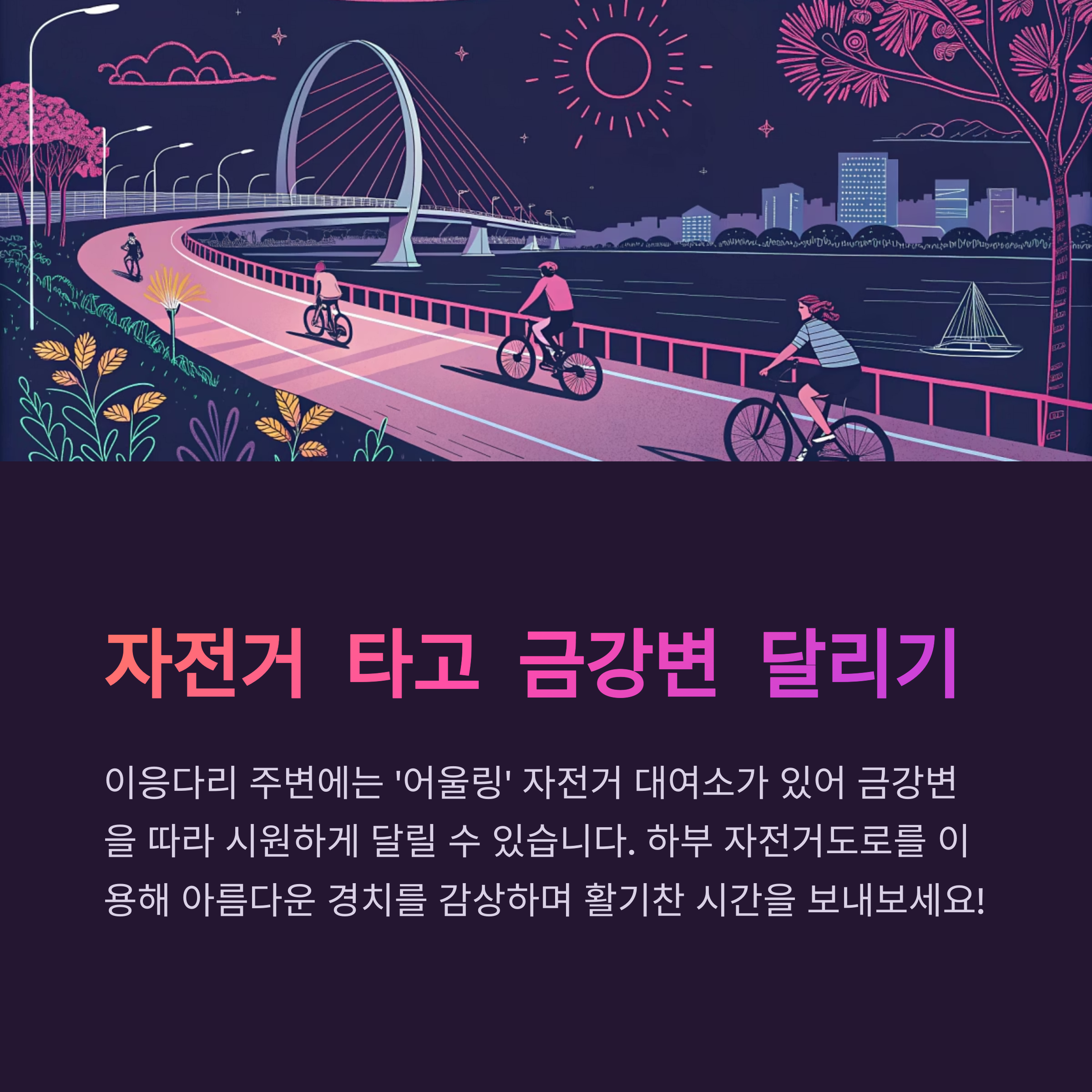 이응다리 주변에는 자전거 대여소인 '어울링' 스테이션이 있어, 자전거를 타고 금강변을 따라 시원하게 달려볼 수 있답니다. 아름다운 경치를 감상하며 활기찬 시간을 보내보세요!
