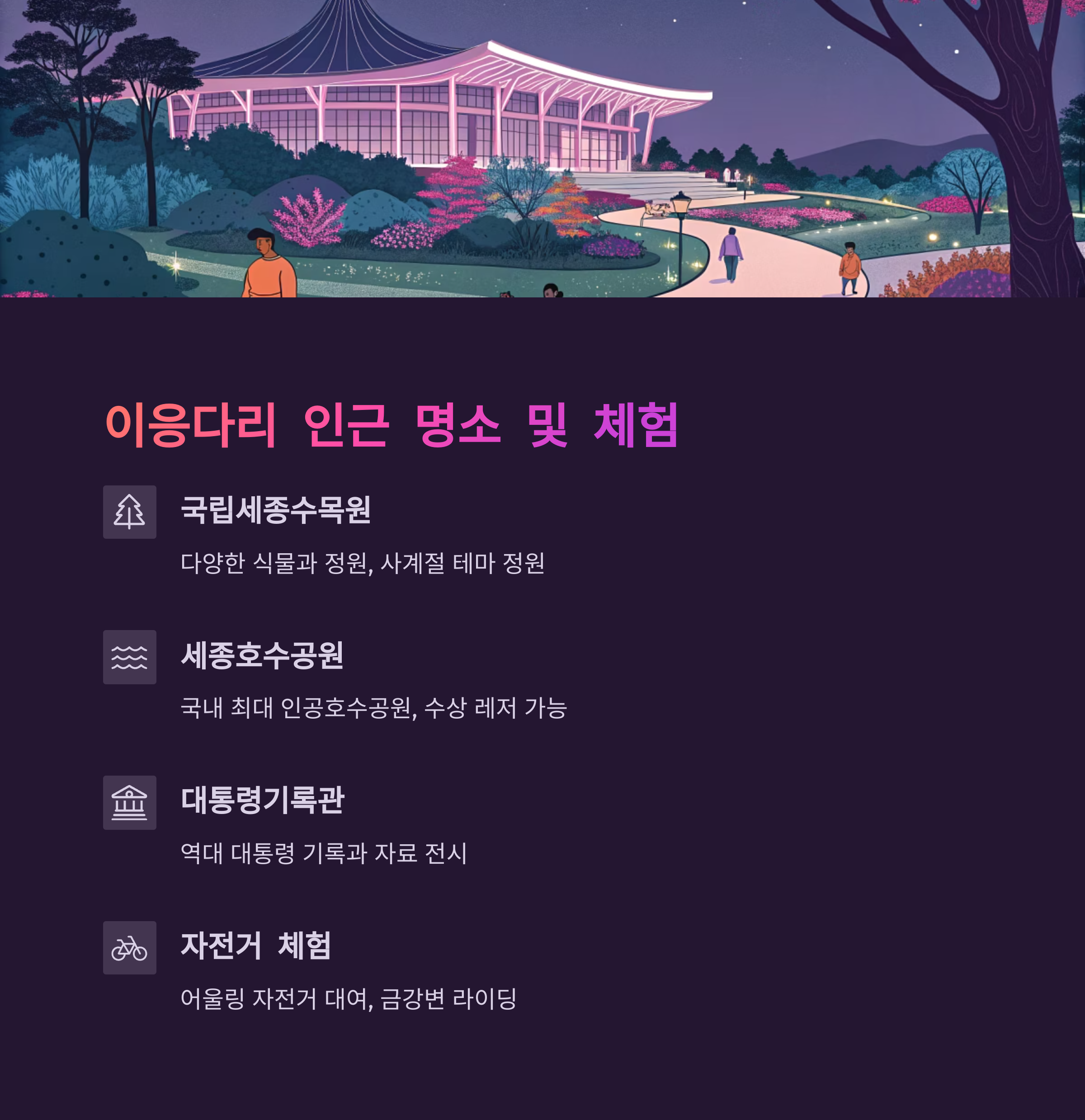 - 국립세종수목원: 다양한 식물과 아름다운 정원이 조성되어 있어 자연 속에서 휴식을 취하기 좋습니다. 사계절 다른 테마로 꾸며져 언제 방문해도 좋아요.