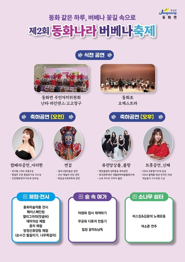 장성군 동화면은 지역 주민들의 정성으로 가꿔진 버베나 꽃길을 배경으로 방문객들에게 잊지 못할 추억을 선사할 준비를 마쳤습니다. 동화면의 아름다운 자연 속에서 펼쳐질 특별한 축제를 만나보세요.