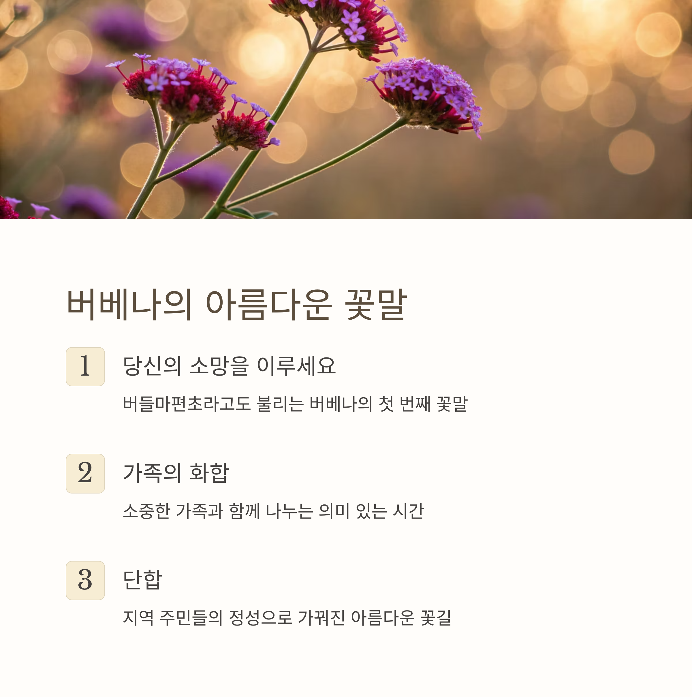- "보랏빛 버베나 꽃밭이 정말 환상적이었어요. 사진 찍기 너무 좋아서 인생샷 많이 건졌네요!"
