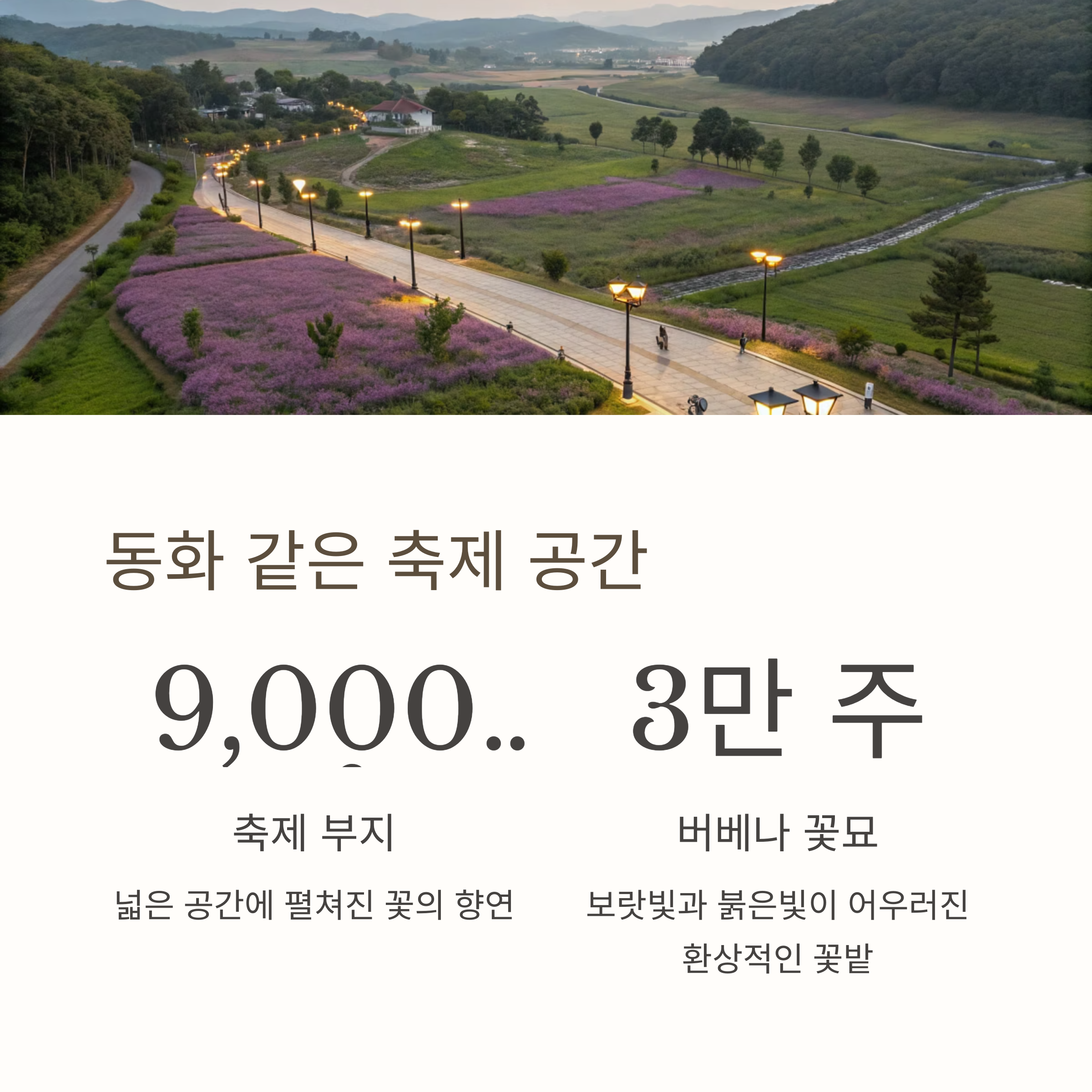 싱그러운 초여름, 보랏빛 물결이 넘실대는 꿈같은 풍경을 만끽하고 싶다면 '제2회 동화나라 버베나축제'를 주목해 주세요. '버들마편초'라고도 불리는 버베나는 '당신의 소망을 이루세요', '가족의 화합', '단합'이라는 아름다운 꽃말을 가지고 있습니다.