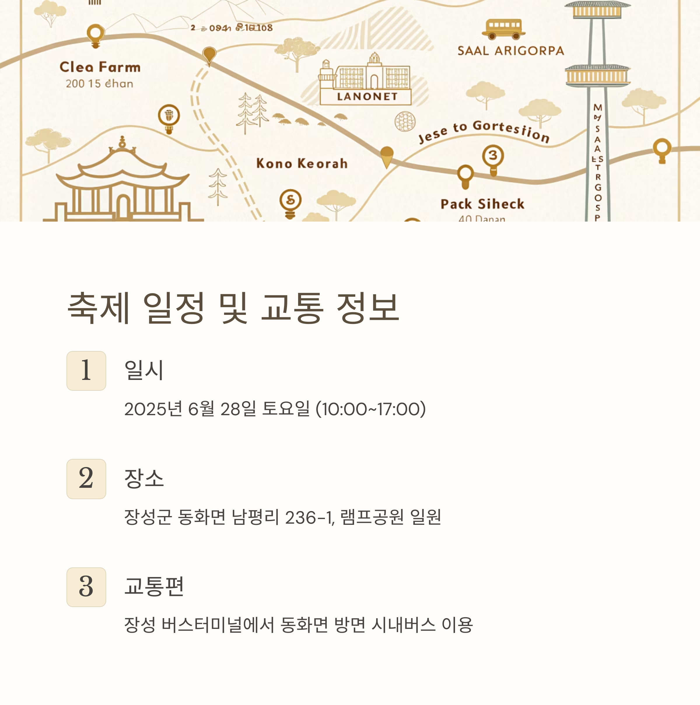 - 자차 이용 시: 내비게이션에 '장성군 동화면 남평리 236-1' 또는 '동화나라 버베나축제'를 검색하면 됩니다. 축제장 주변에 주차 공간이 마련될 예정이지만, 당일 혼잡할 수 있으므로 가급적 일찍 도착하거나 대중교통 이용을 고려하는 것이 좋습니다.