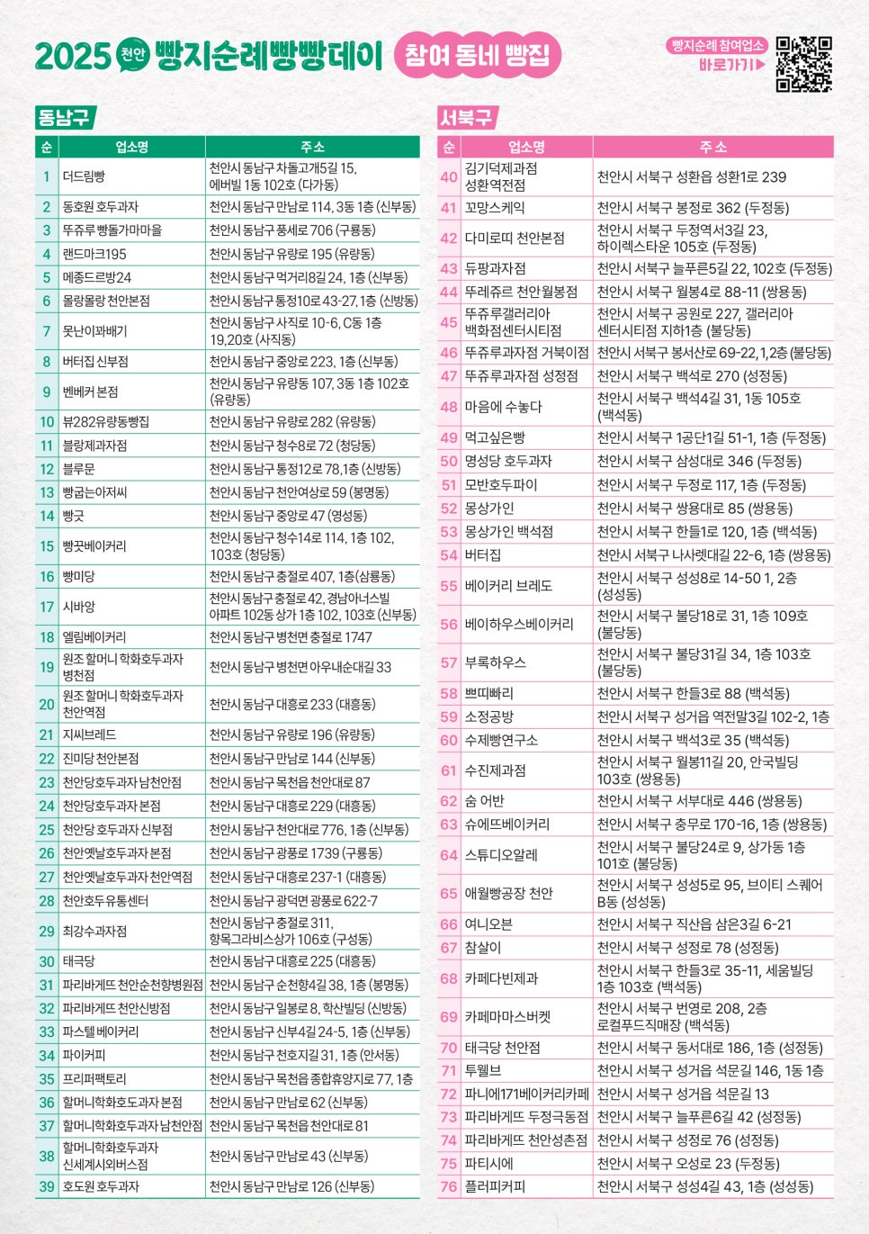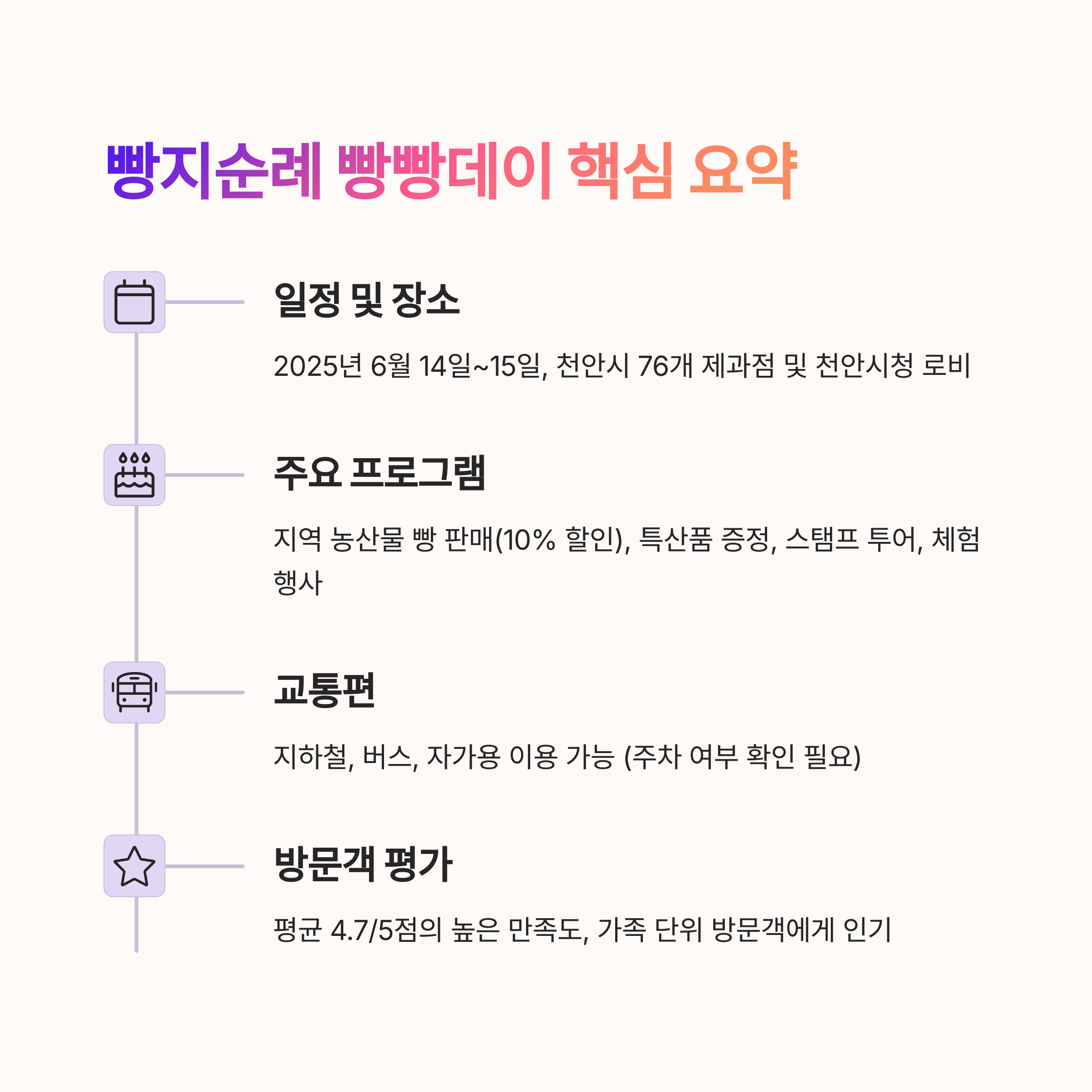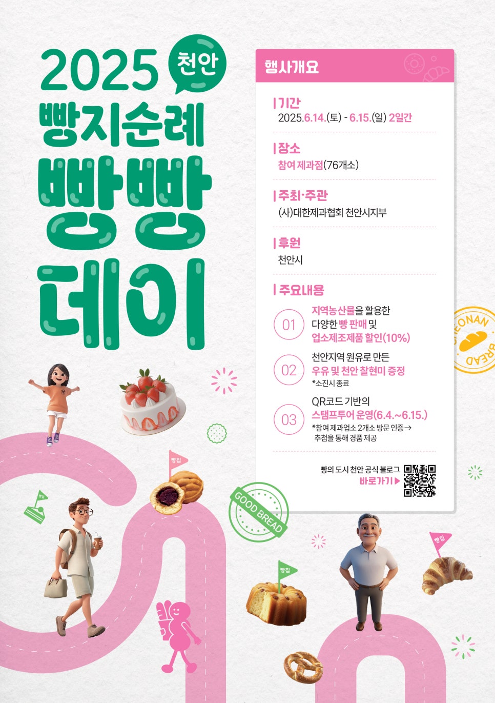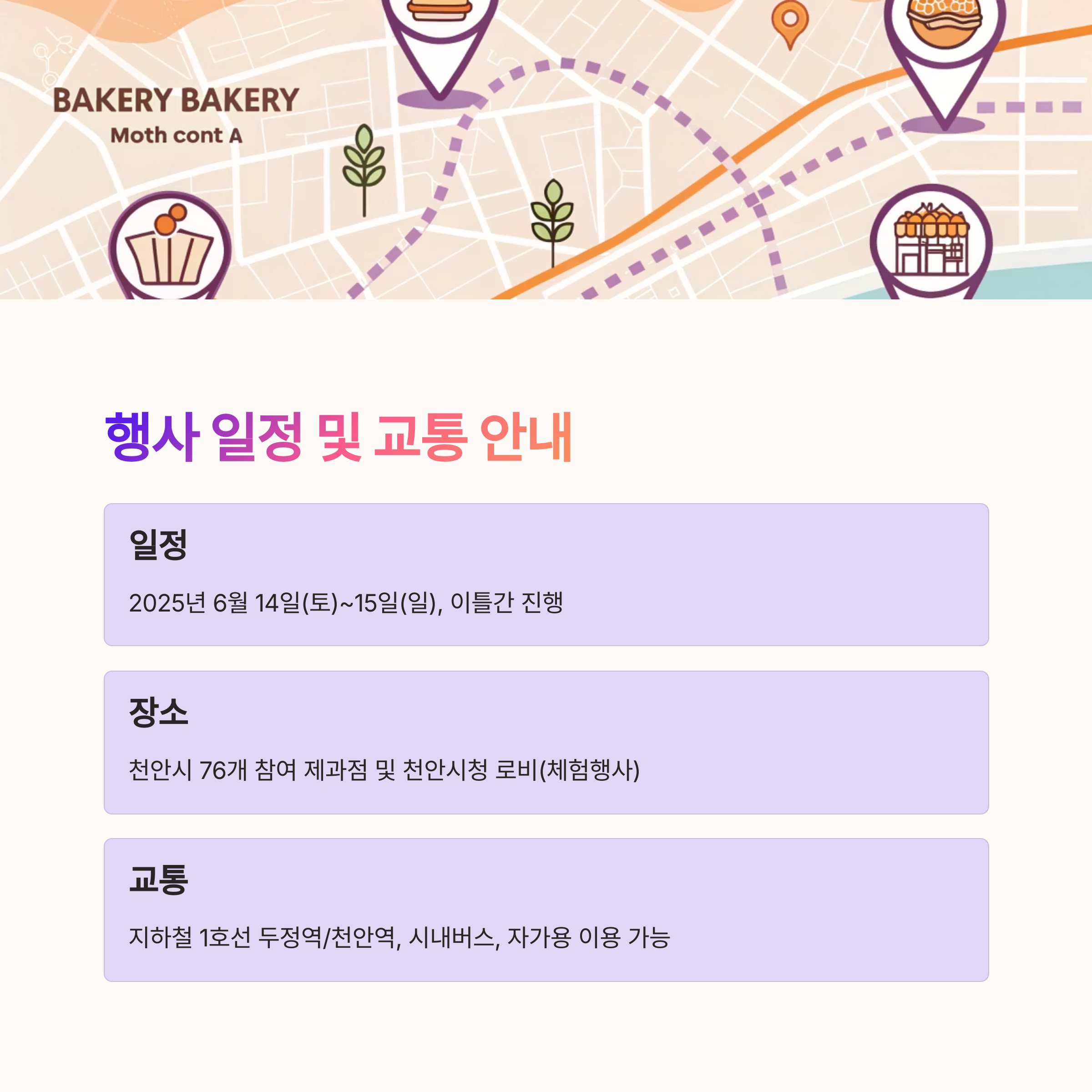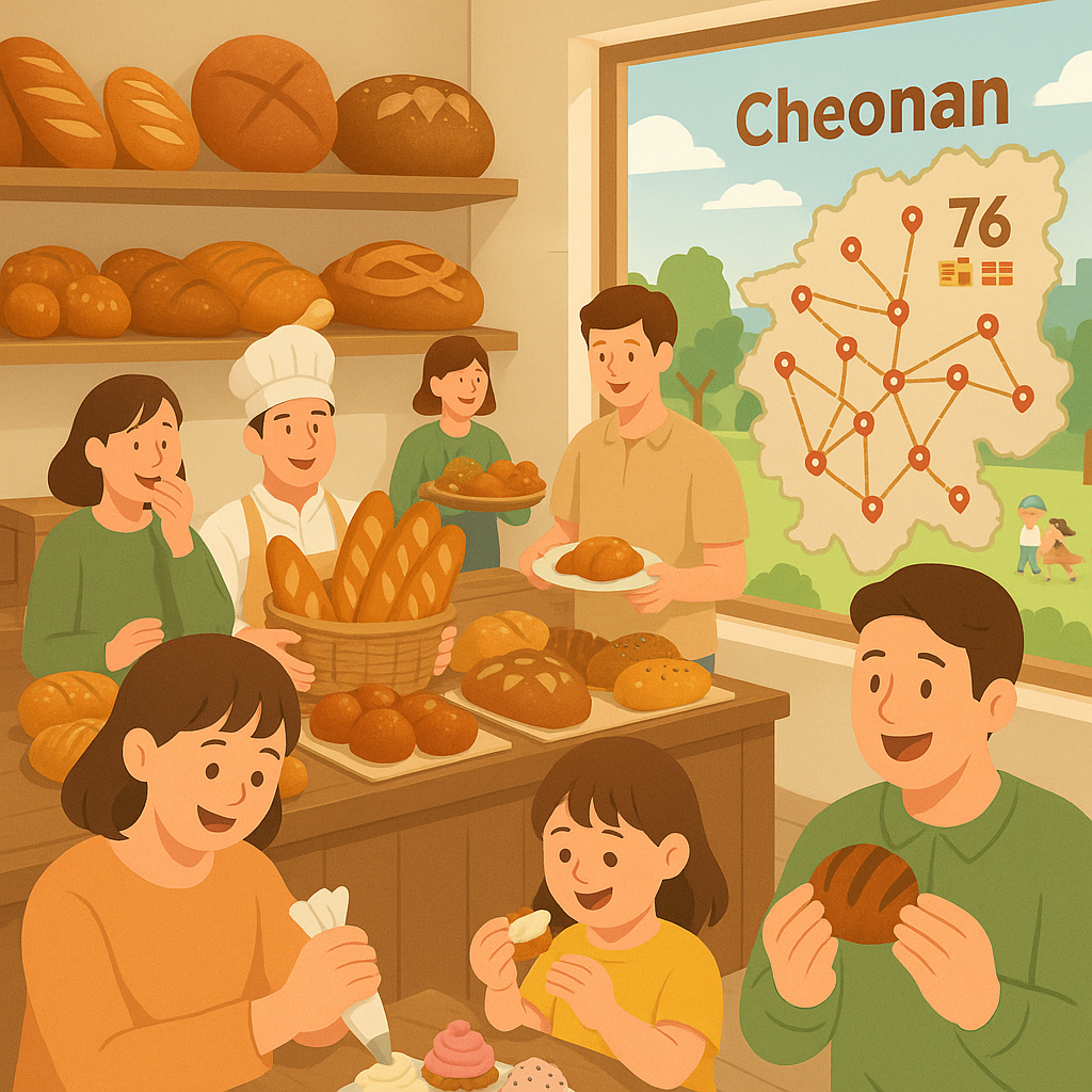 - 기간 및 장소: 2025년 6월 14일(토)부터 15일(일)까지 천안시 내 76개 참여 제과점에서 진행됩니다. 체험 행사는 천안시청 로비(1층)에서 열립니다.