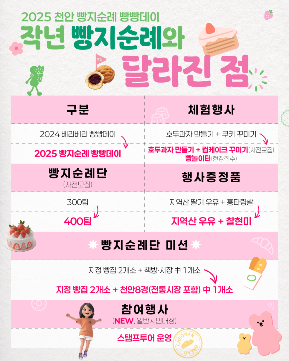 - 체험 행사 (호두과자 만들기, 컵케이크 꾸미기): 천안시청 로비(1층)에서 진행되며, 현장 접수 가능한 '빵놀이터' 체험도 마련되어 있습니다. (사전 신청 대상자 우선)