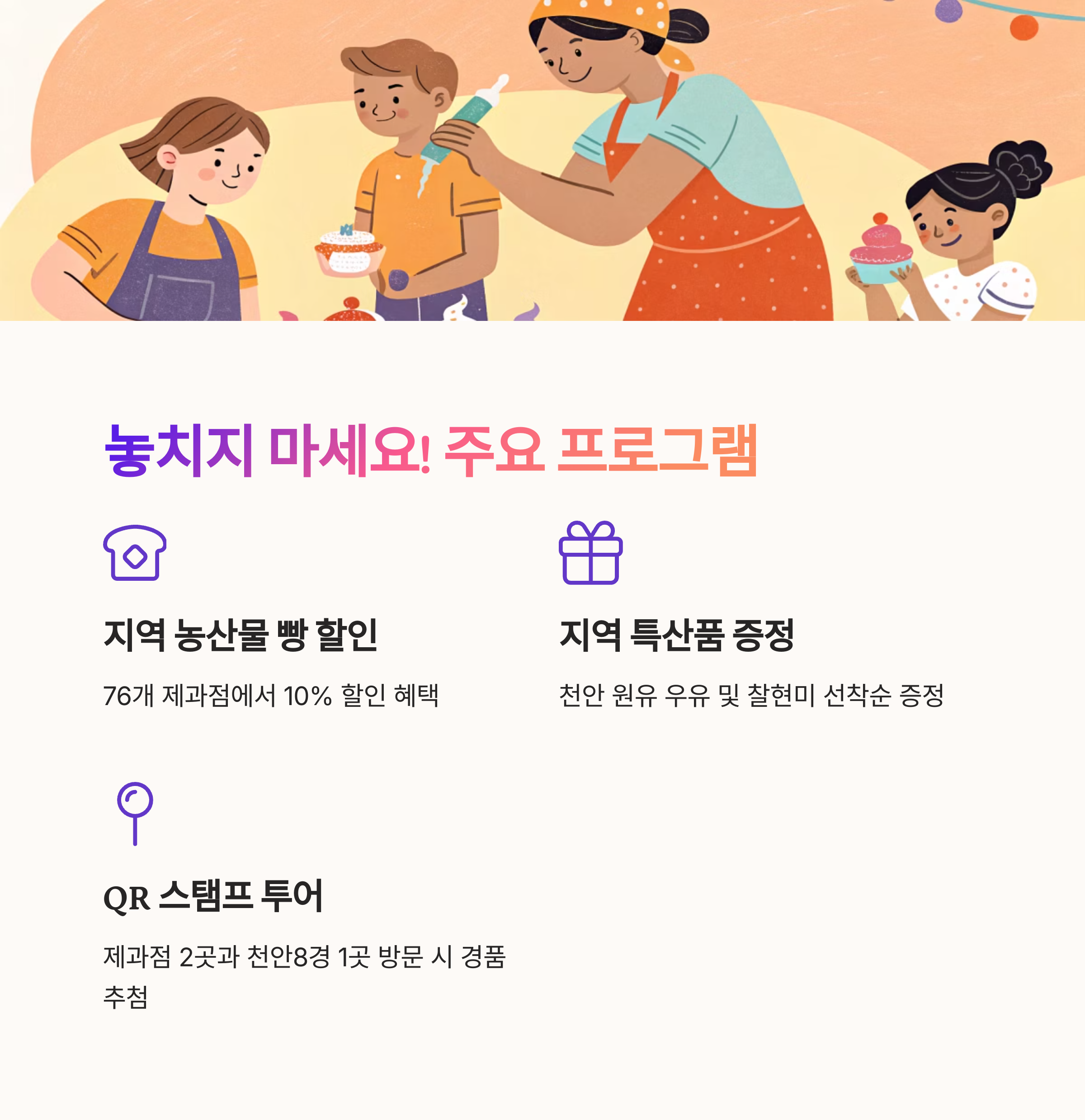 - 주요 내용: 지역 농산물을 활용한 빵 판매 및 10% 할인, 천안 지역 원유 우유 및 찰현미 증정, QR코드 기반 스탬프 투어 (경품 증정), 호두과자 만들기 및 컵케이크 꾸미기 체험 등이 있습니다.