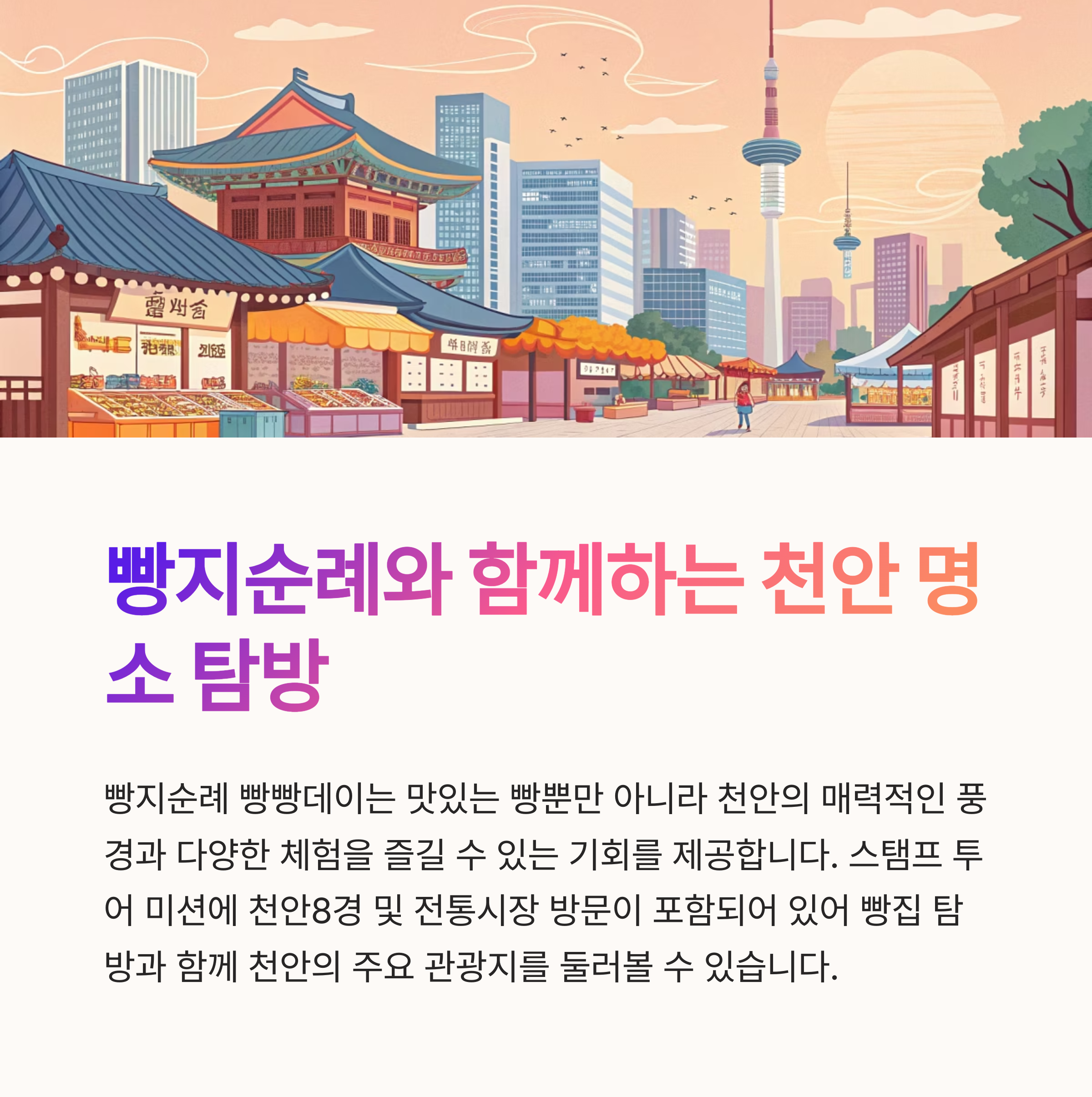 - 주변 즐길 거리: 빵지순례와 함께 천안8경 (독립기념관, 유관순열사 유적 등) 및 전통시장을 방문하여 천안의 다양한 매력을 경험할 수 있습니다.