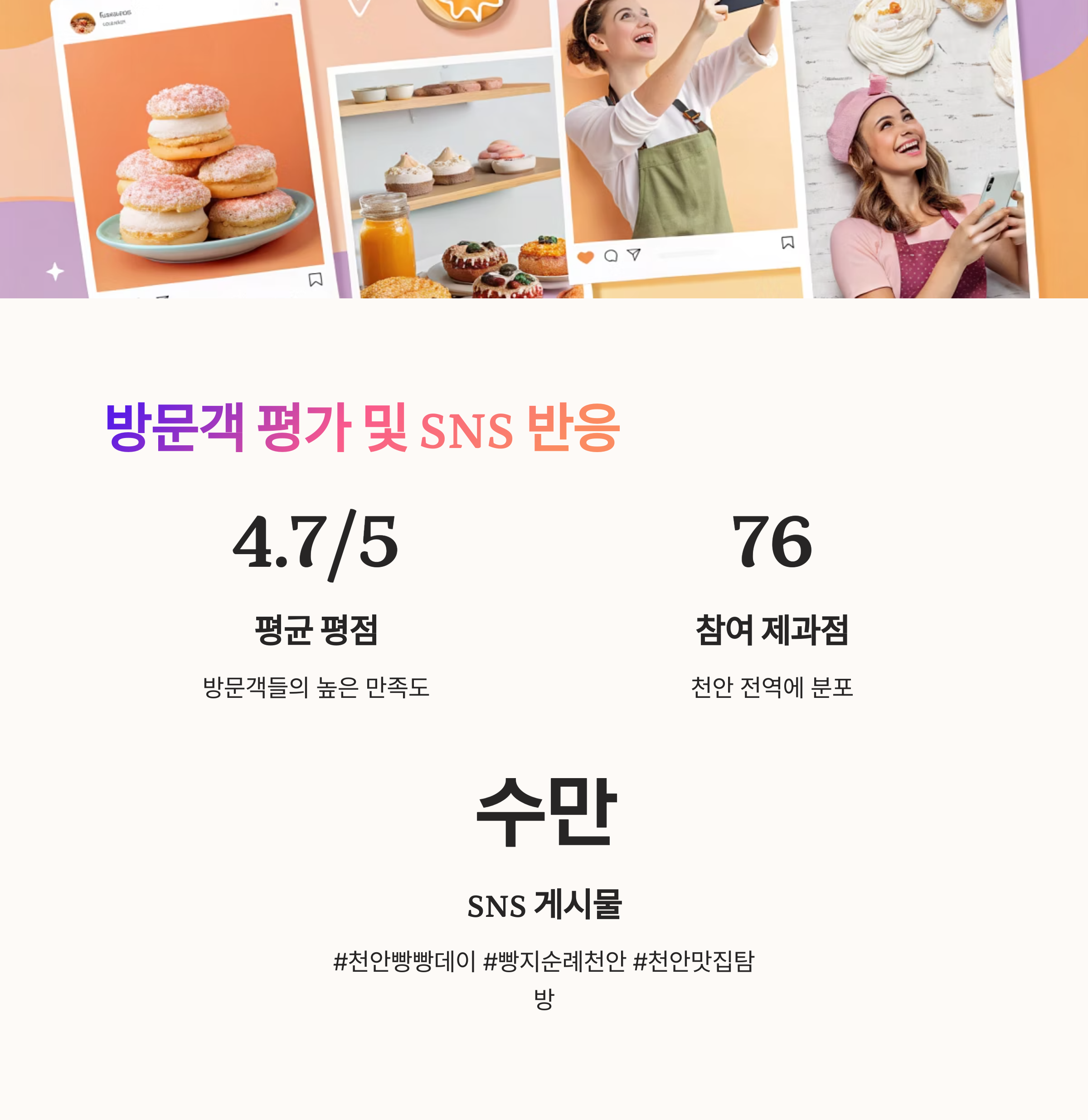 - 방문객 반응 및 평가: 빵 맛과 체험 프로그램, 스탬프 투어에 대한 긍정적인 반응이 많았으며, 특히 가족 단위 방문객에게 인기가 높았습니다. 인스타그램 해시태그가 활발하며, 평균 4.7/5점의 높은 만족도를 보였습니다.
