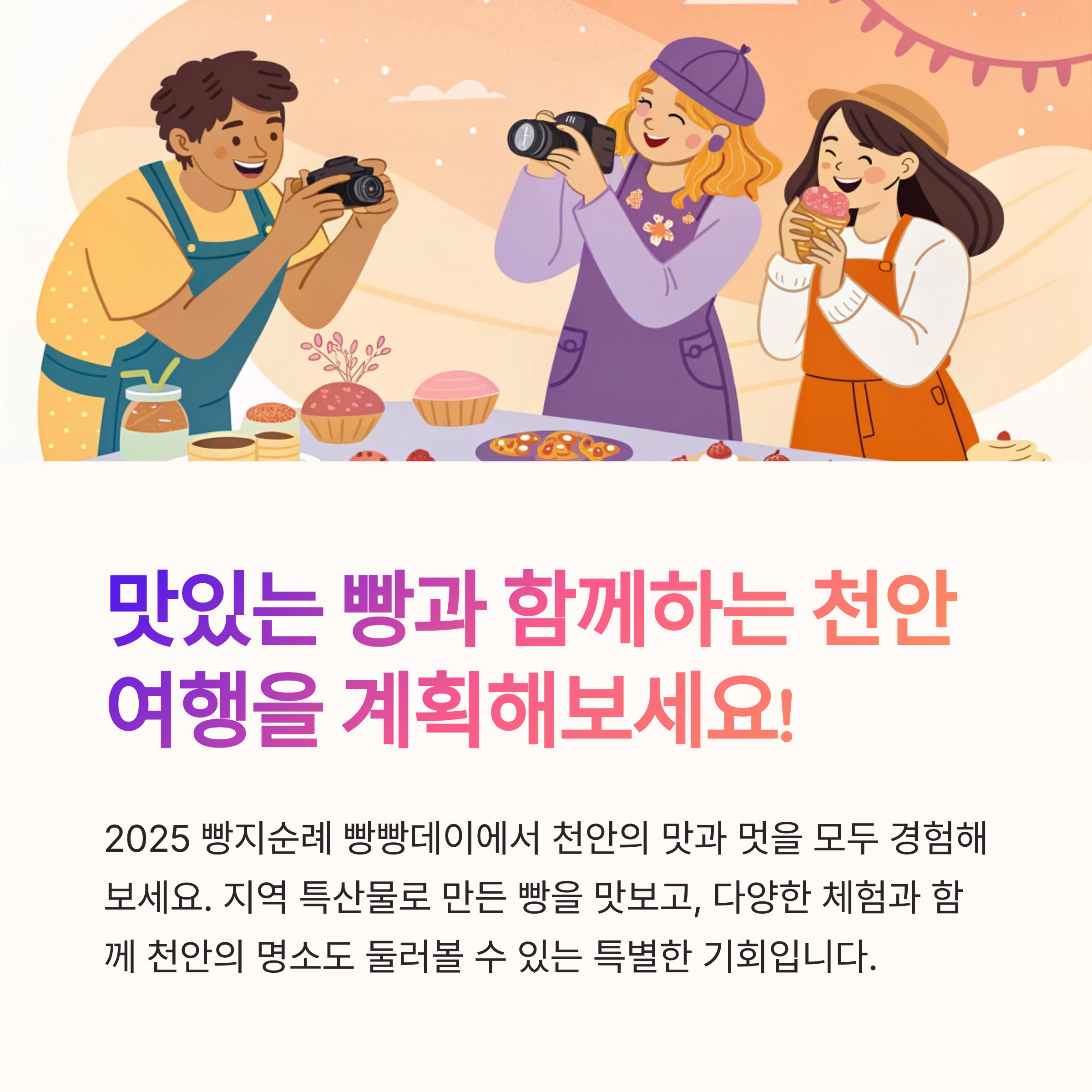 2025 빵지순례 빵빵데이는 천안의 자랑스러운 지역 농산물을 활용한 특별한 빵들을 맛보고, 참여 제과점에서 다양한 혜택을 누릴 수 있는 특별한 행사입니다. 단순히 빵을 맛보는 것을 넘어, 천안의 숨겨진 명소들을 탐방하며 미식과 여행을 동시에 즐길 수 있는 기회를 제공합니다.