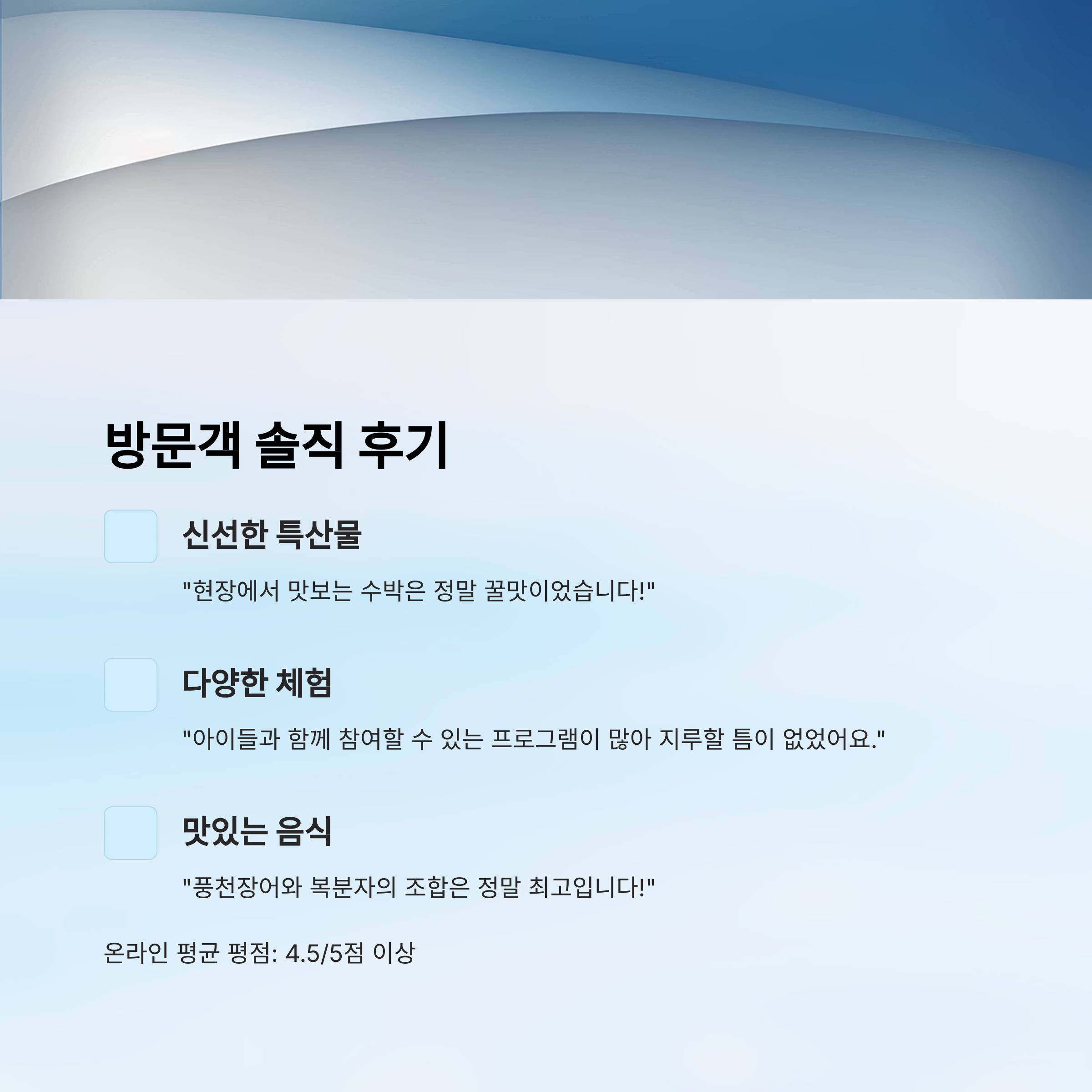 - 높은 방문객 만족도: 신선한 특산물, 풍성한 먹거리, 다양한 체험 등으로 방문객들의 긍정적인 후기가 많습니다.