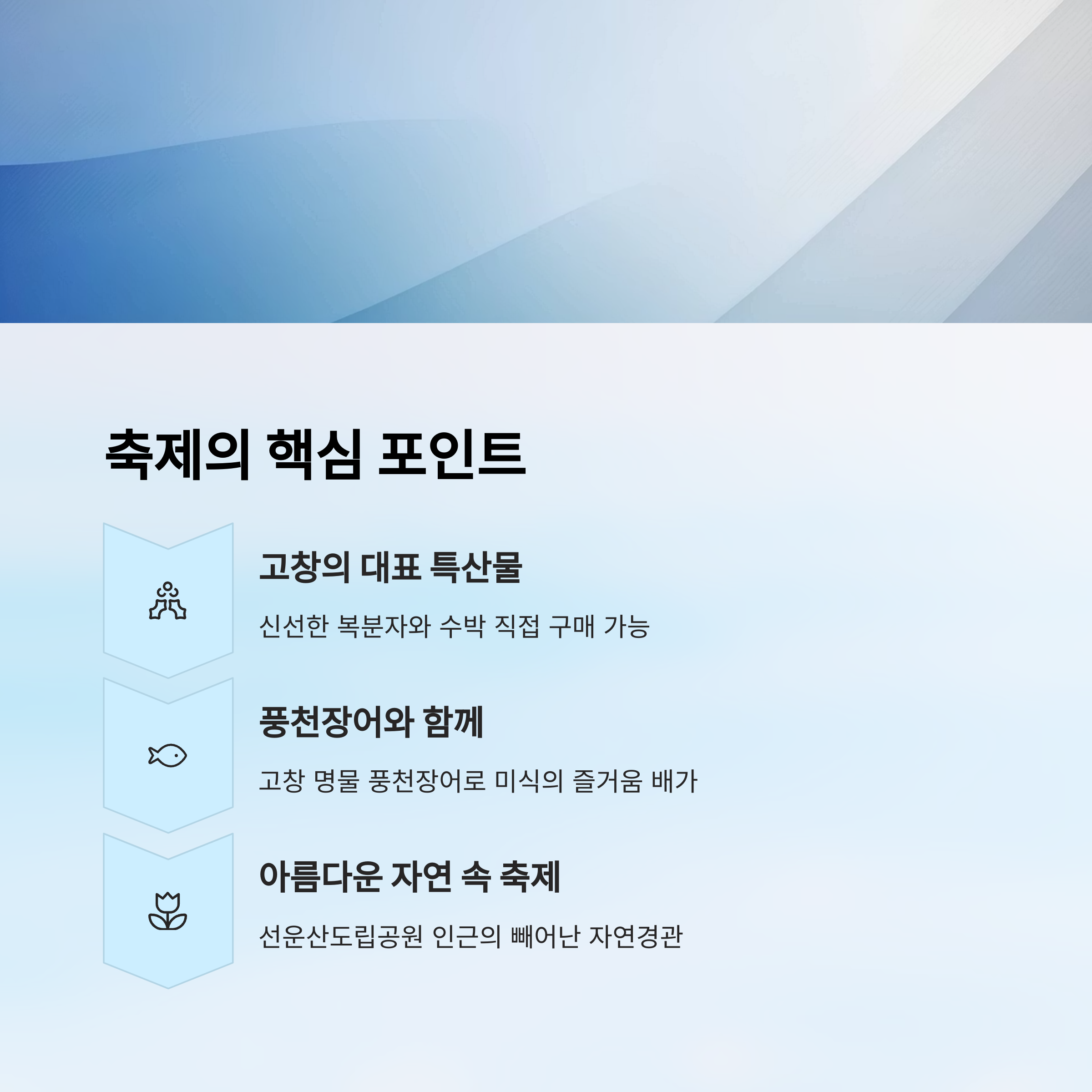 - 아름다운 자연 속 축제: 선운산도립공원 인근에 위치하여 축제와 함께 고창의 빼어난 자연경관을 감상할 수 있습니다.