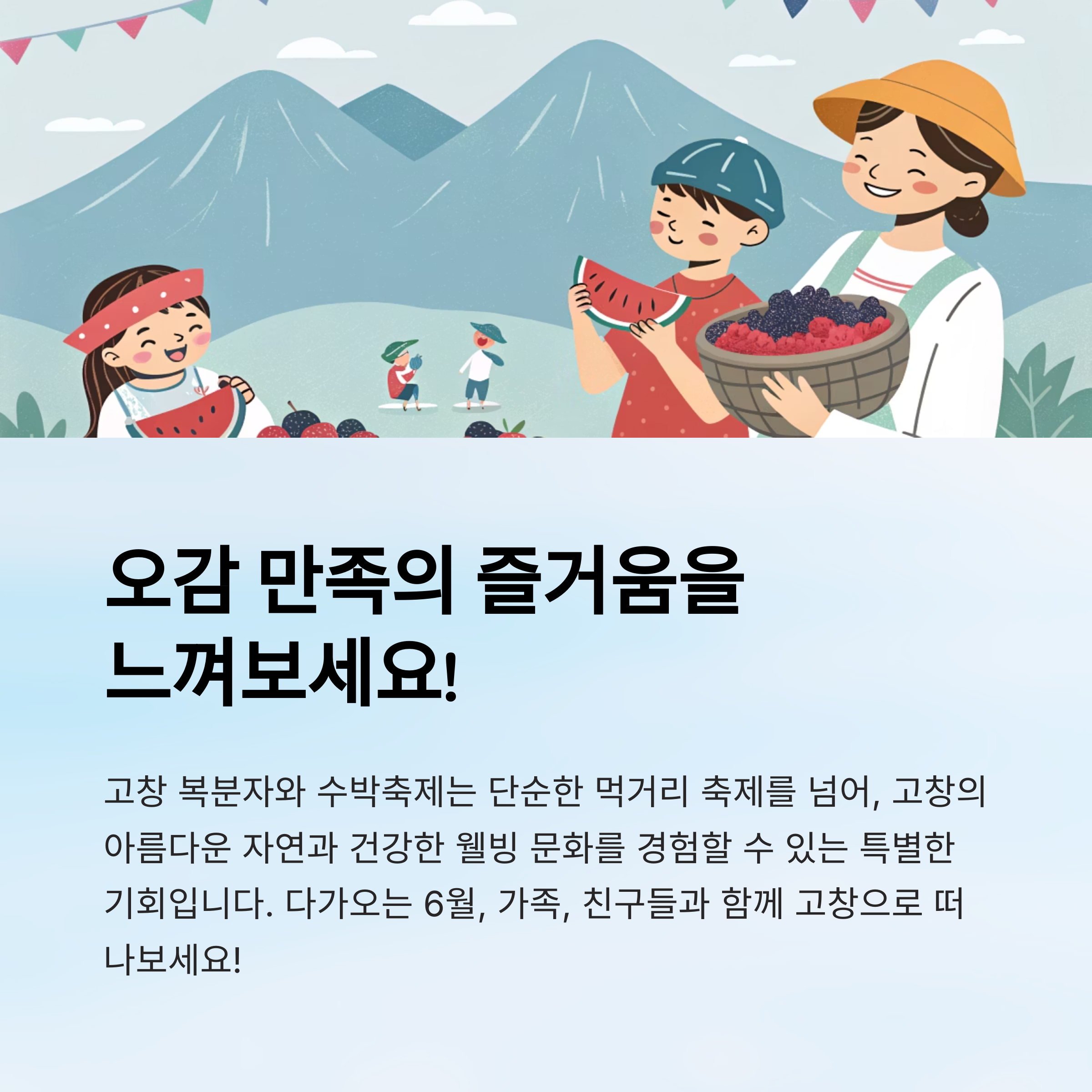 고창 복분자와 수박축제는 단순한 먹거리 축제를 넘어, 고창의 아름다운 자연과 건강한 웰빙 문화를 경험할 수 있는 특별한 기회입니다. 다가오는 6월, 가족, 친구들과 함께 고창으로 떠나 오감 만족의 즐거움을 느껴보시는 건 어떨까요?