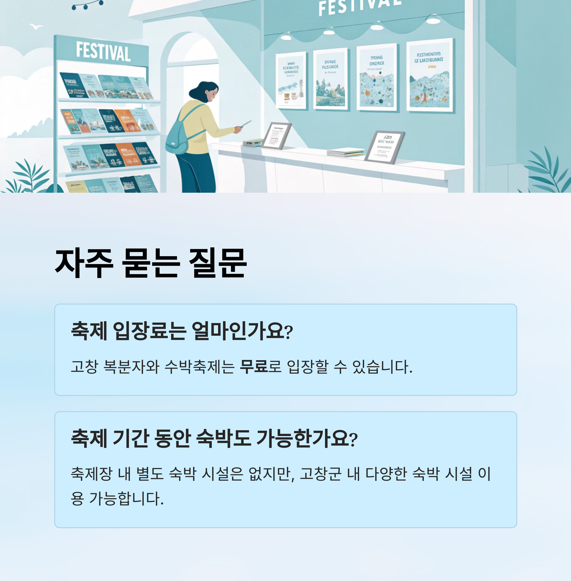고창 복분자와 수박축제를 방문한다면, 축제 외에도 고창의 다양한 매력을 경험할 수 있는 근처 명소와 체험 프로그램들을 함께 즐겨보시길 추천합니다.