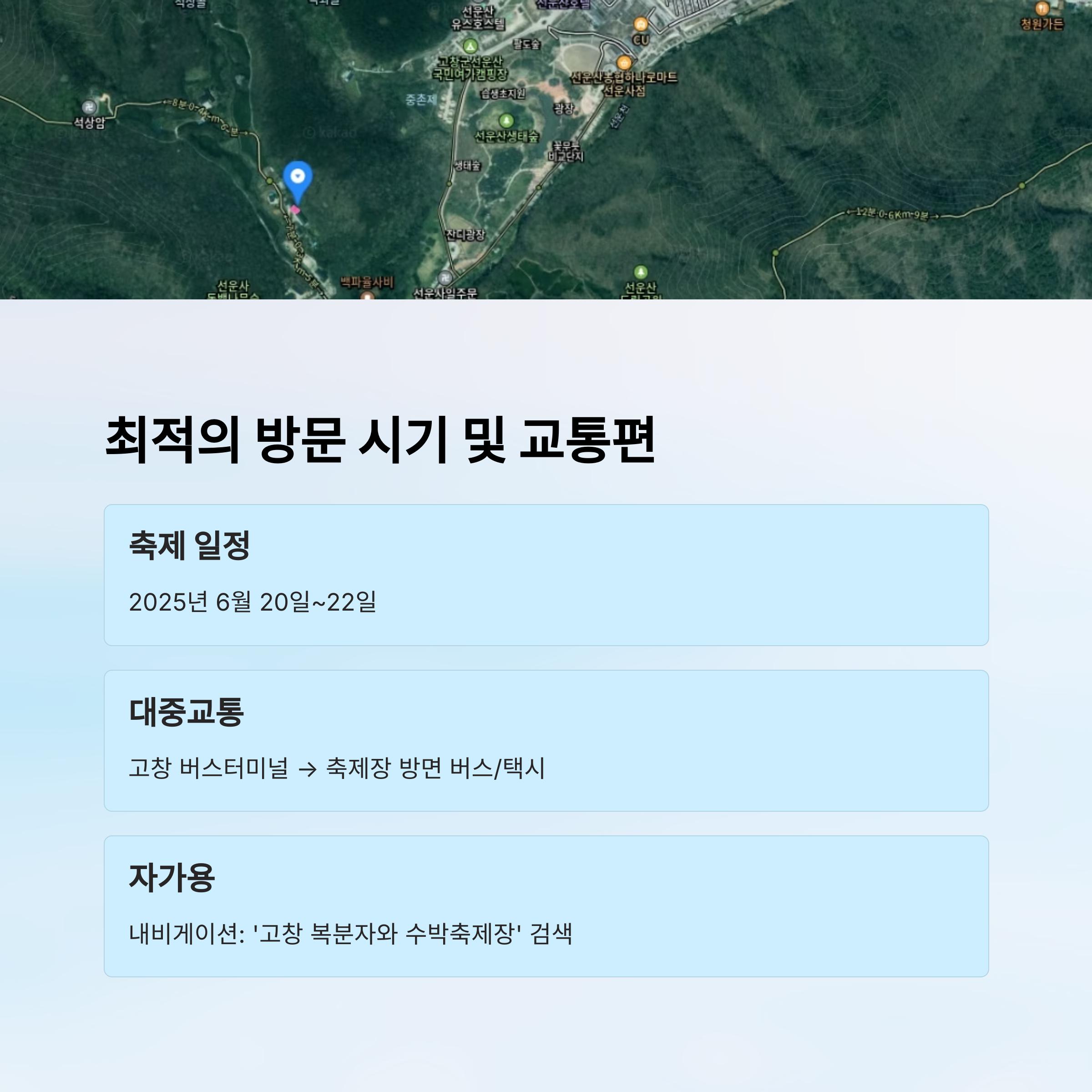 - 내비게이션에 '전북특별자치도 고창군 아산면 선운사로 242-86' 또는 '고창 복분자와 수박축제장'을 검색하여 방문하면 됩니다.