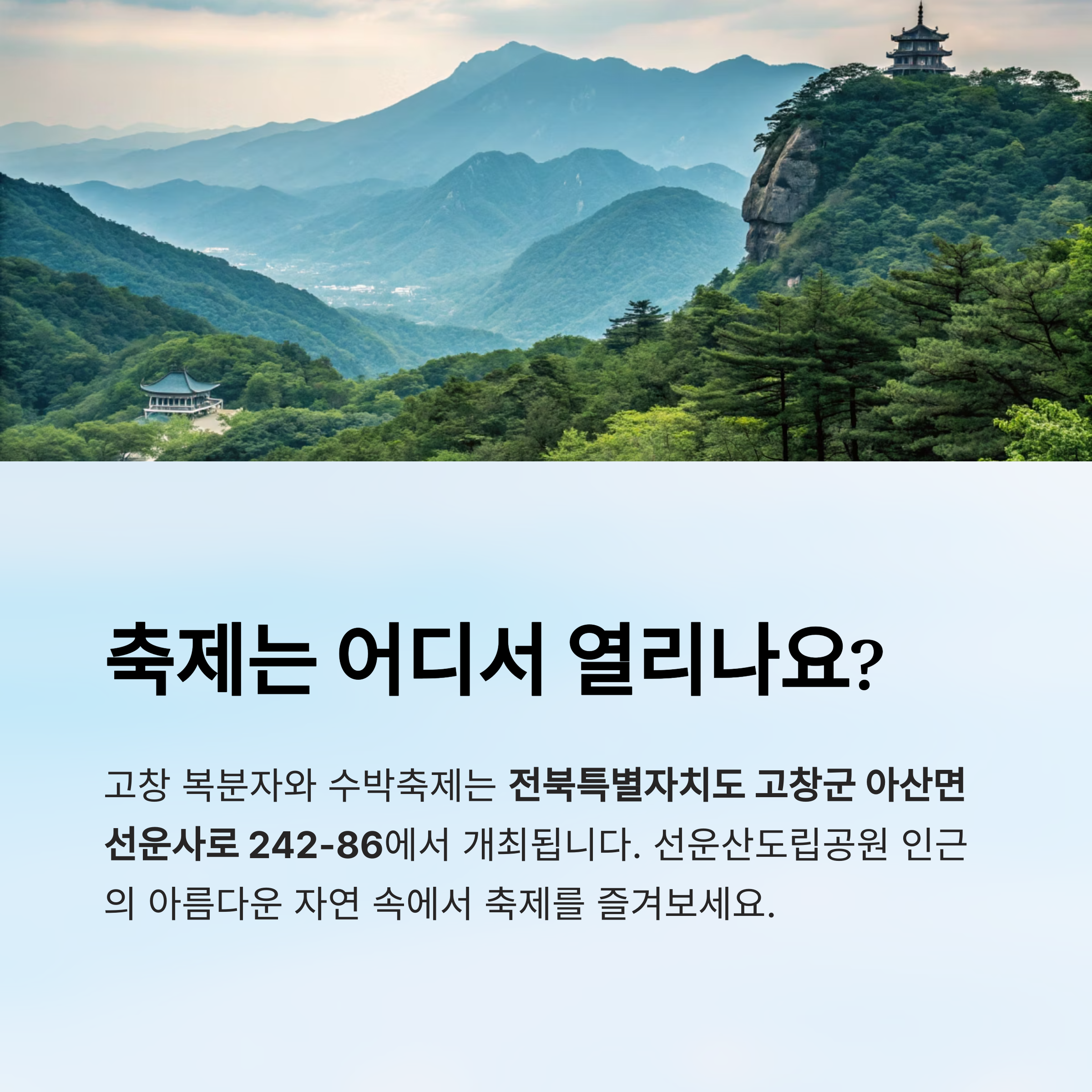고창 복분자와 수박축제는 전북특별자치도 고창군 아산면 선운사로 242-86에서 개최됩니다. 이 지역은 아름다운 자연경관으로 유명한 선운산도립공원 인근에 자리 잡고 있습니다. 축제장은 푸른 산과 맑은 계곡이 어우러진 쾌적한 환경을 자랑하며, 축제를 즐기면서 동시에 고창의 수려한 자연을 만끽할 수 있습니다. 특히, 가을에는 선운사 꽃무릇이 장관을 이루는 곳이기도 합니다.