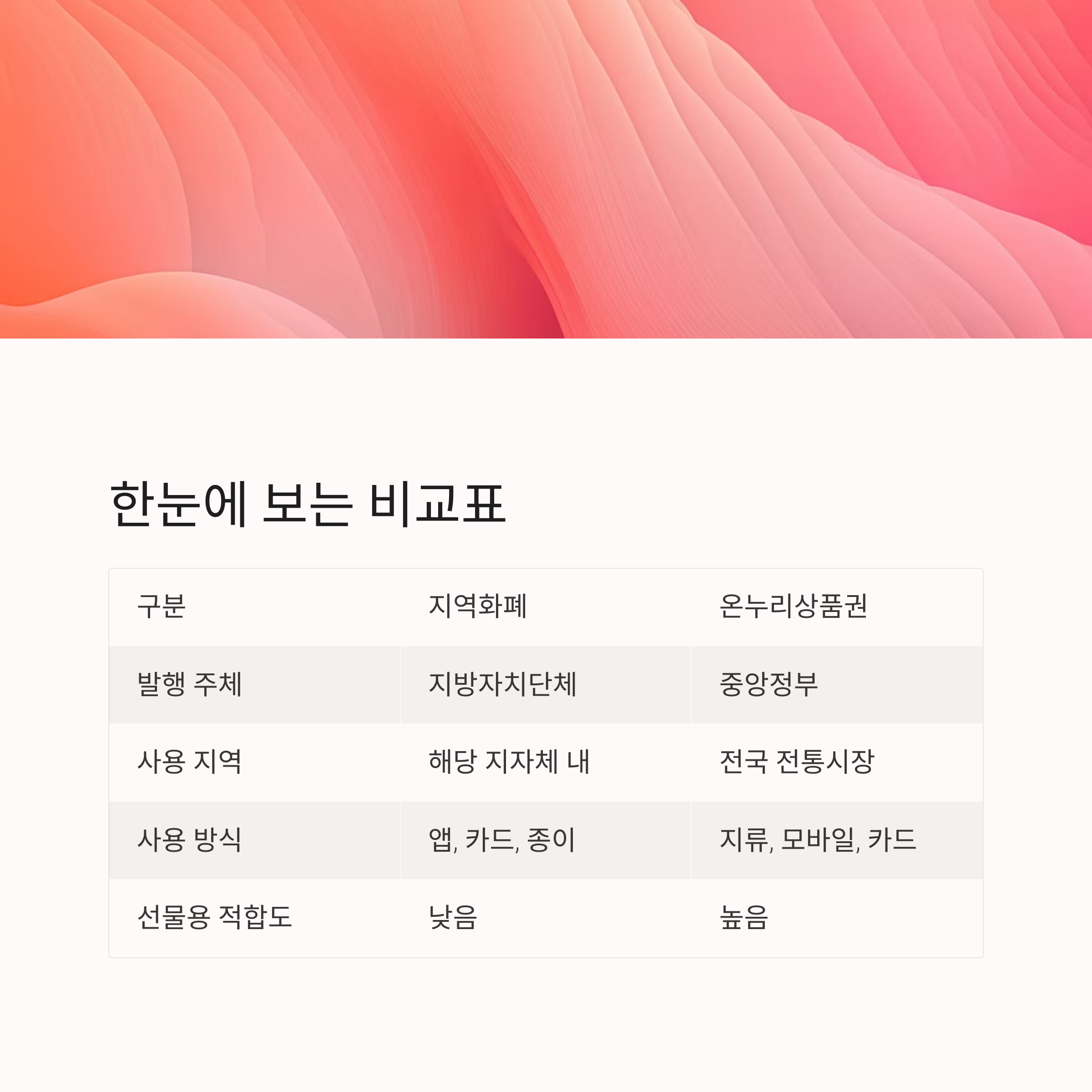| 구분 | 지역화폐(지역사랑상품권) | 온누리상품권 |