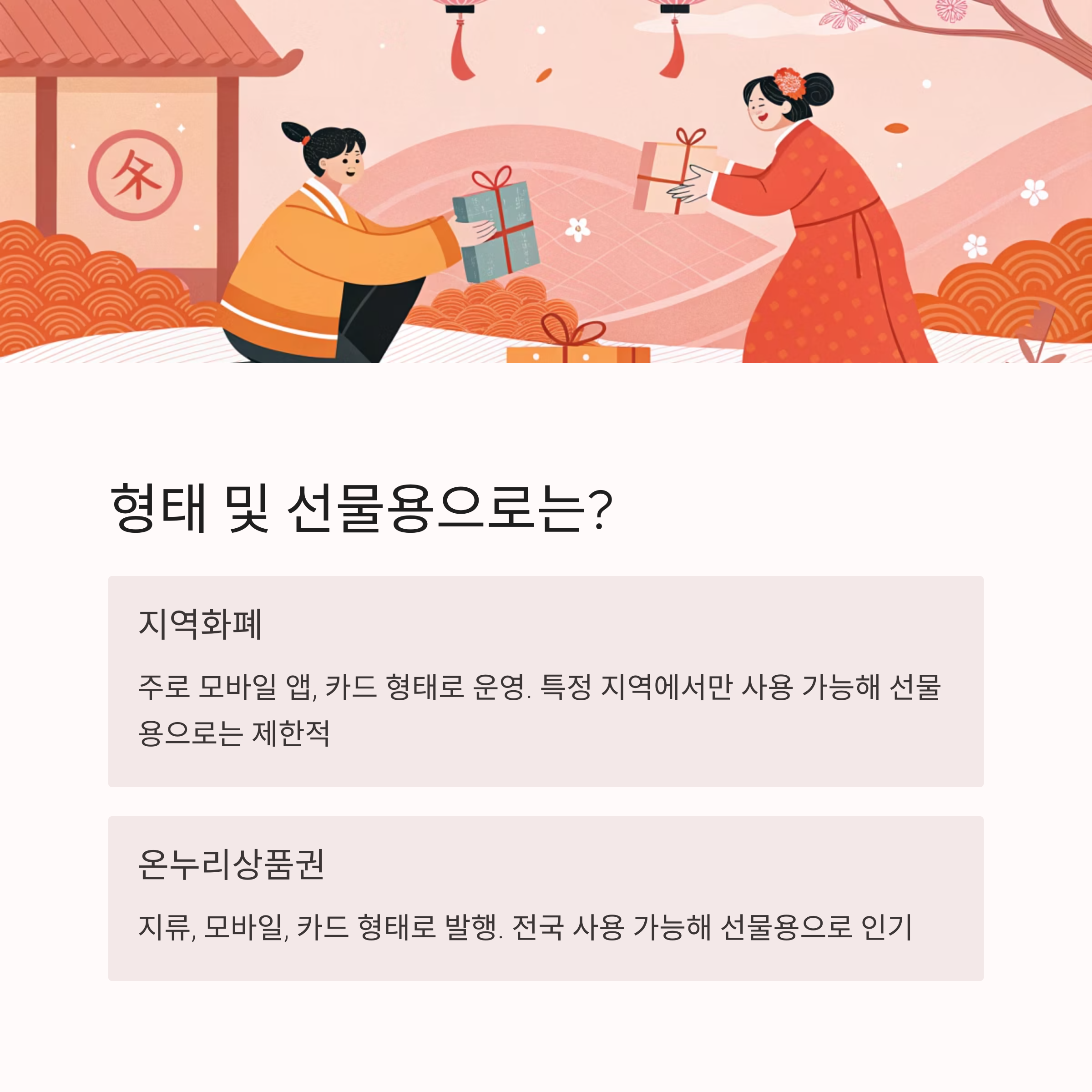 **지류(종이), 모바일, 카드** 등 다양한 형태로 발행돼요. 특히 지류형은 명절 선물이나 격려금 등으로 주고받기에 익숙하고, 전국 전통시장에서 사용 가능하기 때문에 선물용으로 인기가 많아요.