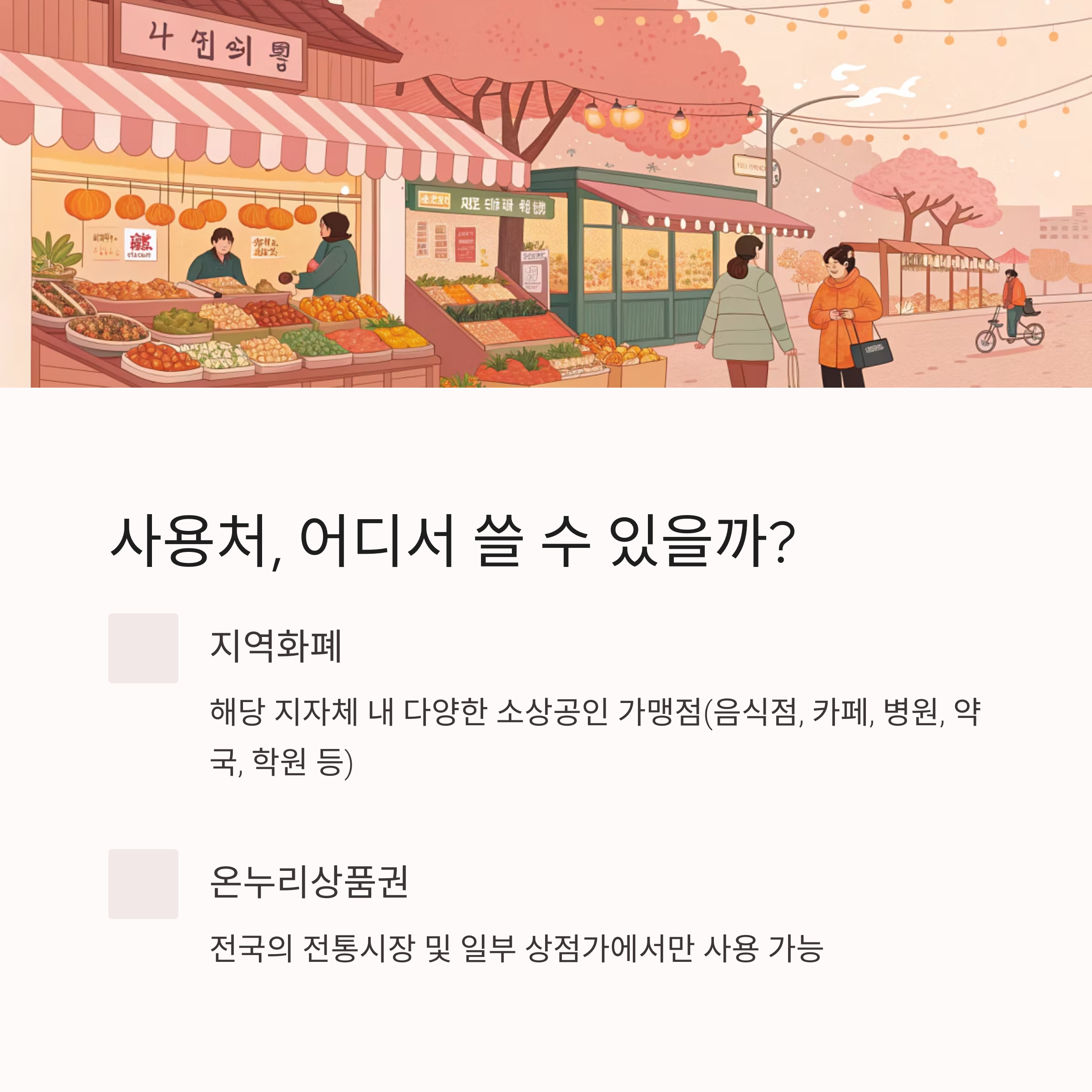해당 지자체 내의 다양한 소상공인 가맹점에서 사용할 수 있어요. 음식점, 카페, 병원, 약국, 학원, 동네 슈퍼, 미용실 등 **정말 광범위**하죠. 하지만 대형마트, 백화점, 기업형 슈퍼마켓(SSM), 프랜차이즈 직영점, 유흥·사행업소 등은 사용이 제한돼요. 지역별로 연 매출 기준(예: 10억~12억 이하)이 있기도 하고요. - 온누리상품권: