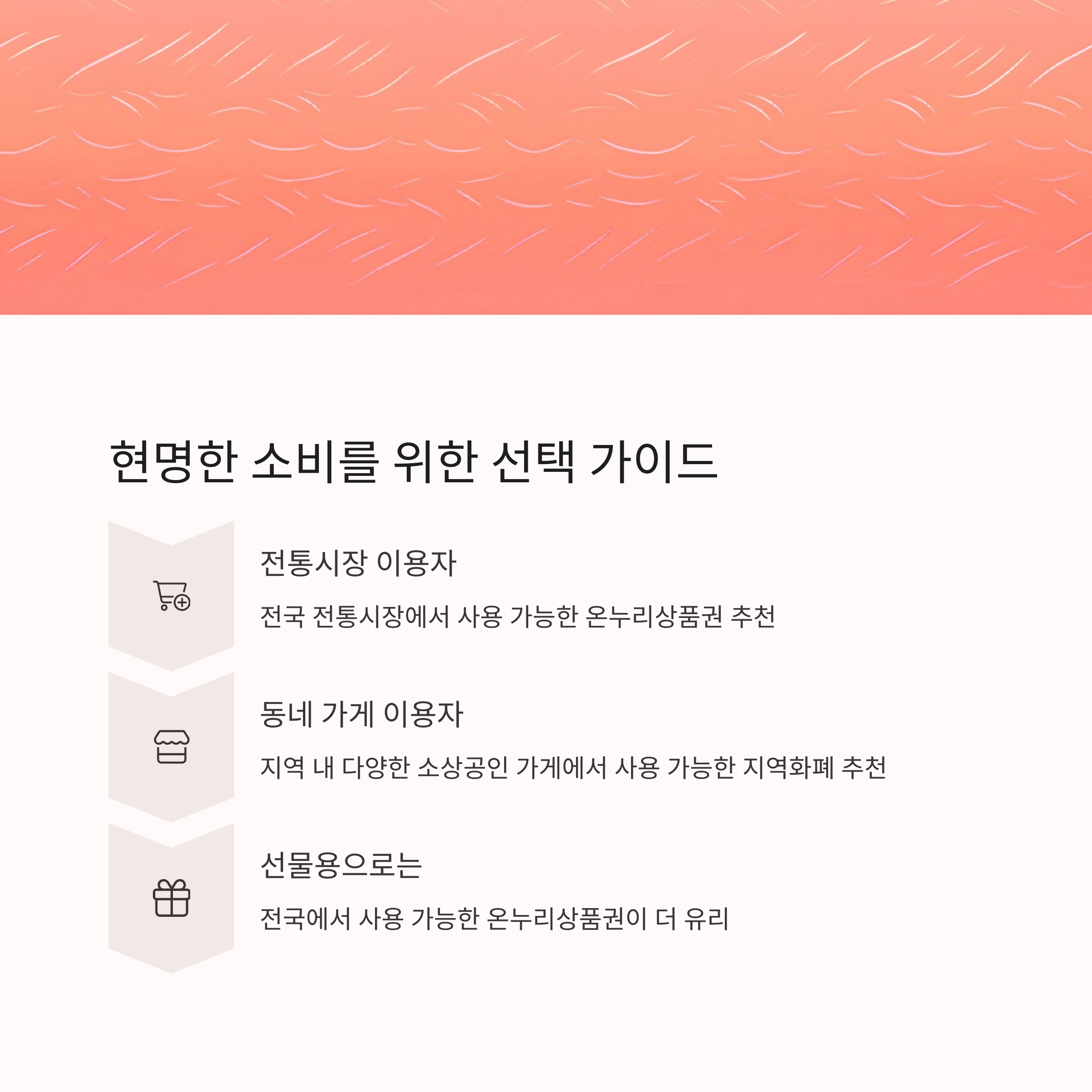 주로 **모바일 앱, 카드** 형태로 많이 운영되고, 일부 지자체는 종이 상품권도 발행해요. 편리하게 충전하고 사용할 수 있지만, 특정 지역에서만 쓸 수 있다는 점 때문에 선물용으로는 다소 적합도가 낮을 수 있어요. 받는 사람이 해당 지역에 거주하거나 자주 방문해야 유용하니까요. - 온누리상품권: