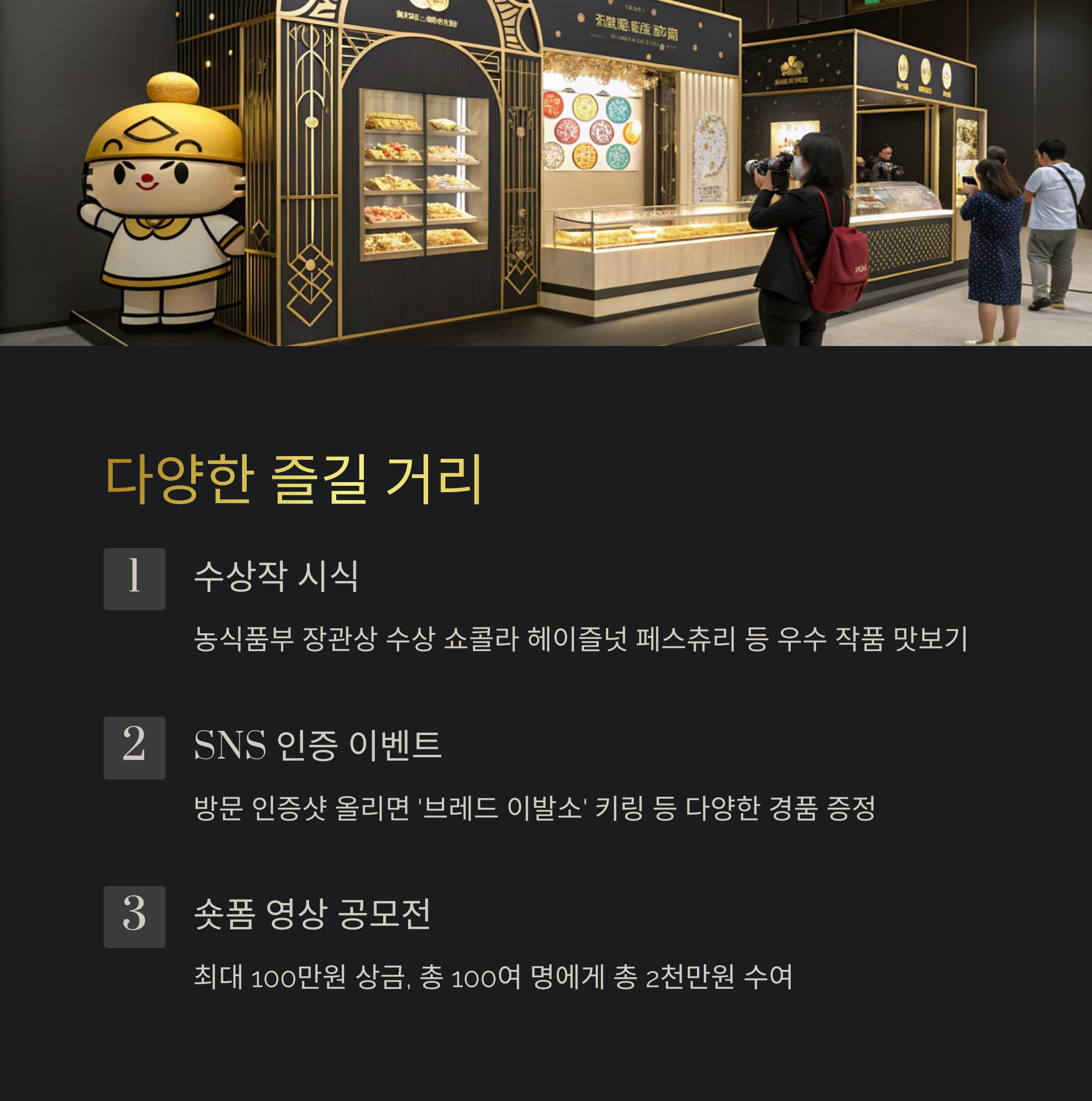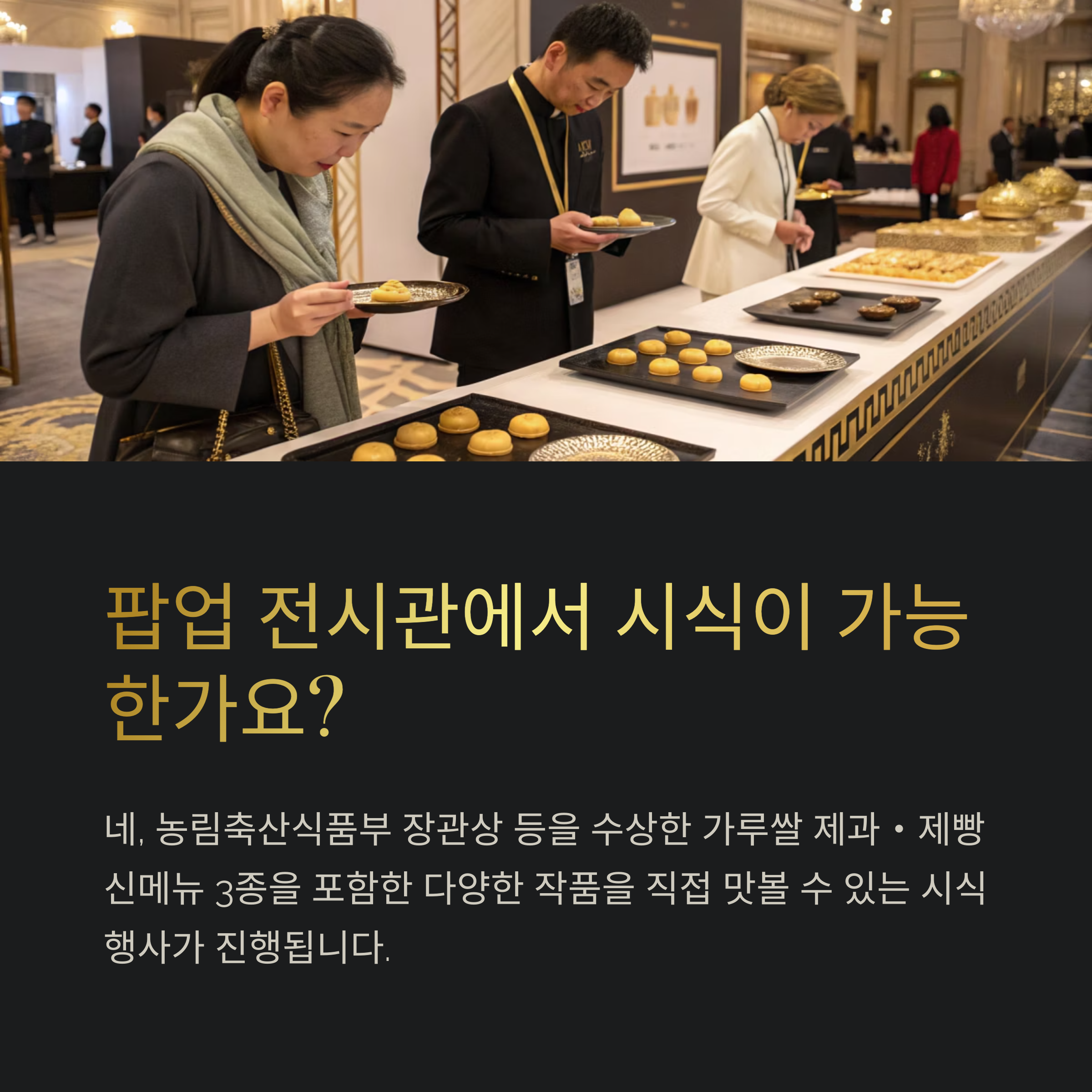 - 가루쌀 제과‧제빵 신메뉴 품평회 수상작 전시 및 시식: 농식품부 장관상을 수상한 쇼콜라 헤이즐넛 페스츄리, 가루쌀로 만든 넛봉, 무화과 버터앤밀크 등 우수 작품을 직접 맛볼 수 있습니다.