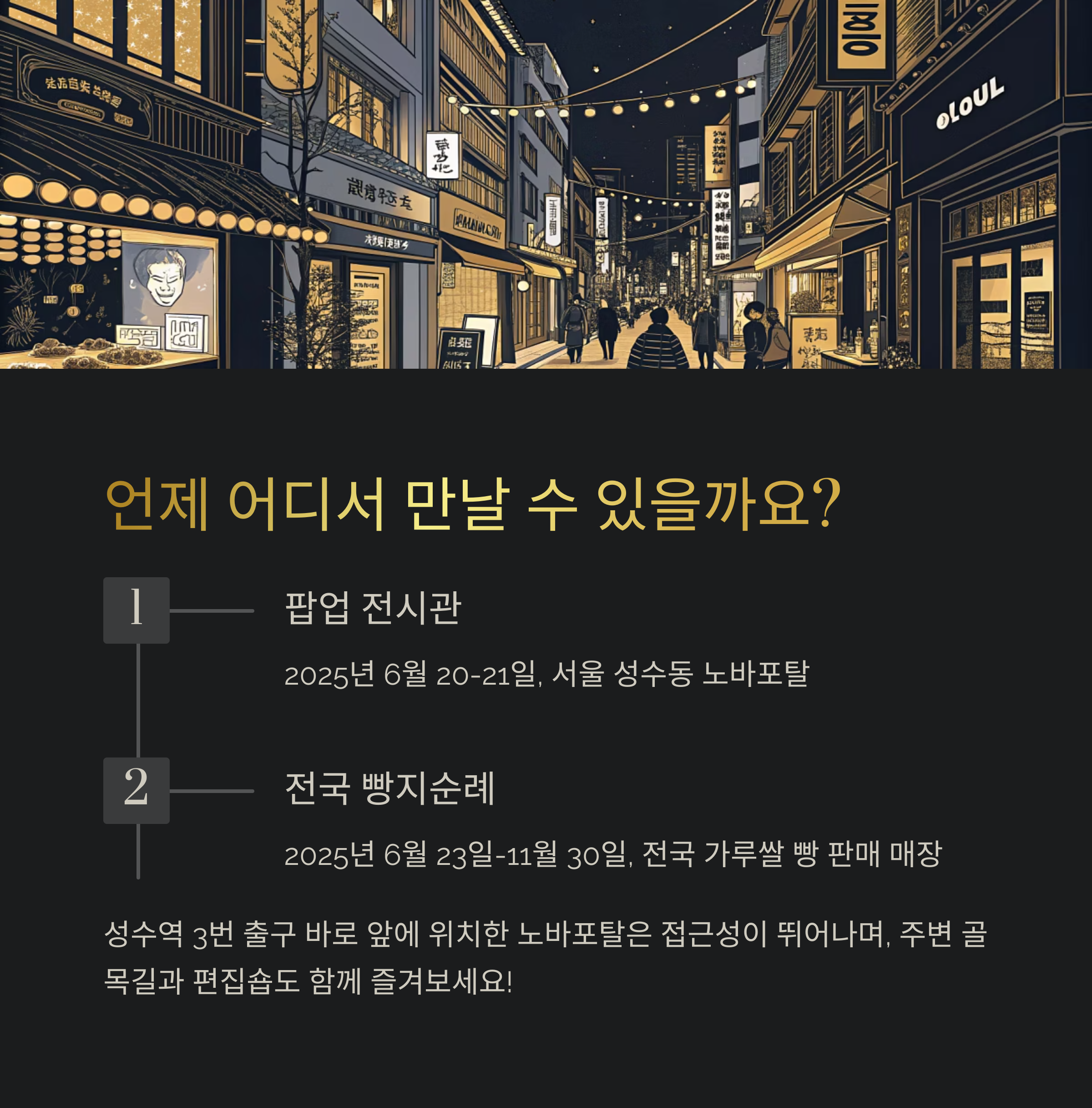 ‘2025 가루쌀 빵지순례’의 핵심인 팝업 전시관은 2025년 6월 20일부터 이틀간 서울 성수동 노바포탈에서 운영됩니다. 서울 성수동은 독특하고 감각적인 카페와 상점들이 즐비해 젊은 층과 트렌드에 민감한 이들에게 큰 인기를 끄는 지역입니다. 특히 성수역 3번 출구 바로 앞에 위치한 노바포탈은 접근성이 뛰어나며, 주변에는 아기자기한 골목길과 다양한 벽화, 그리고 개성 넘치는 편집숍들이 많아 빵지순례와 더불어 성수동 특유의 활기찬 도시 풍경을 함께 즐길 수 있습니다.