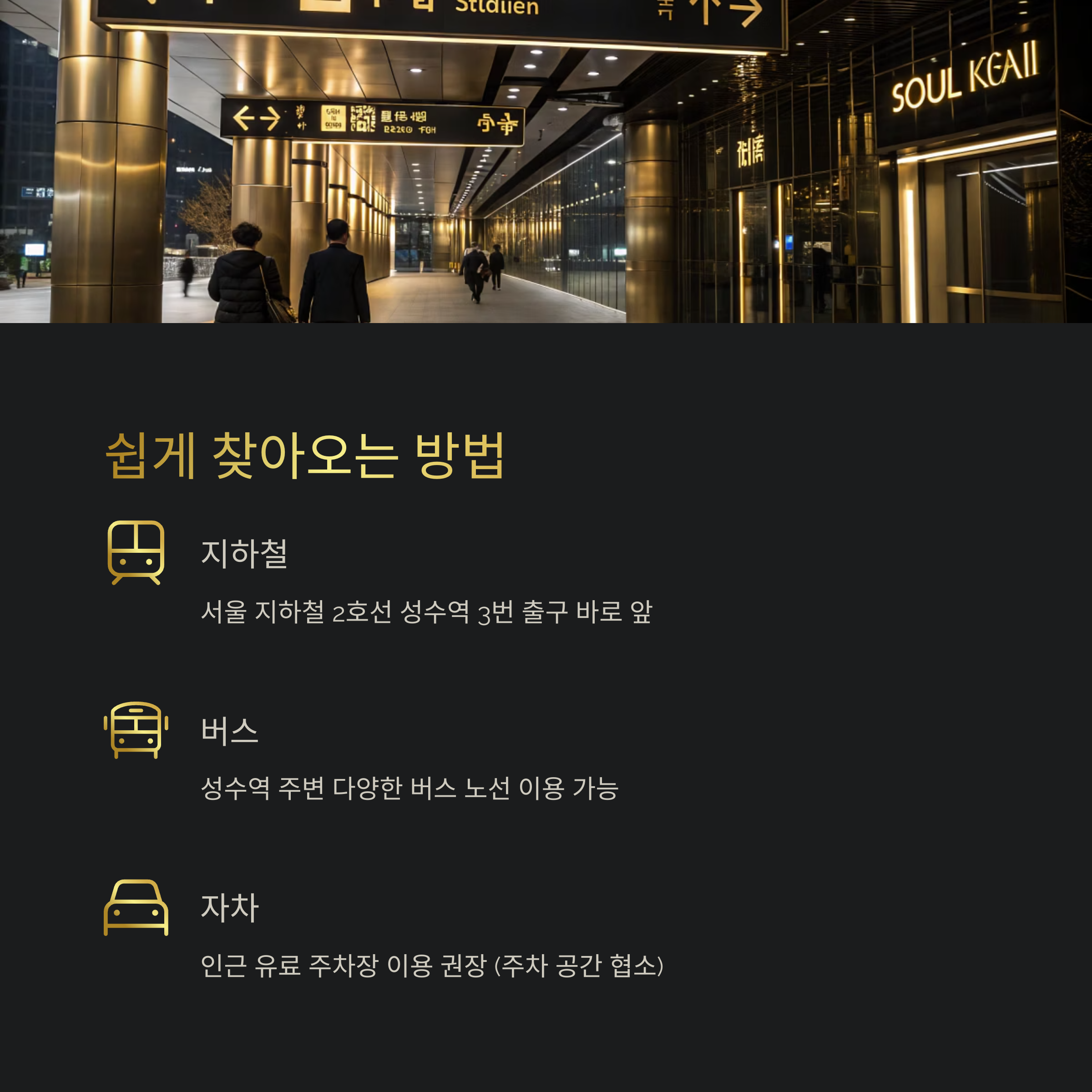 - 버스: 성수역 주변에는 다양한 버스 노선이 운행되고 있습니다. 서울 전역에서 버스를 이용해 성수역 정류장으로 이동 후, 지하철 3번 출구 방향으로 걸어오면 됩니다.