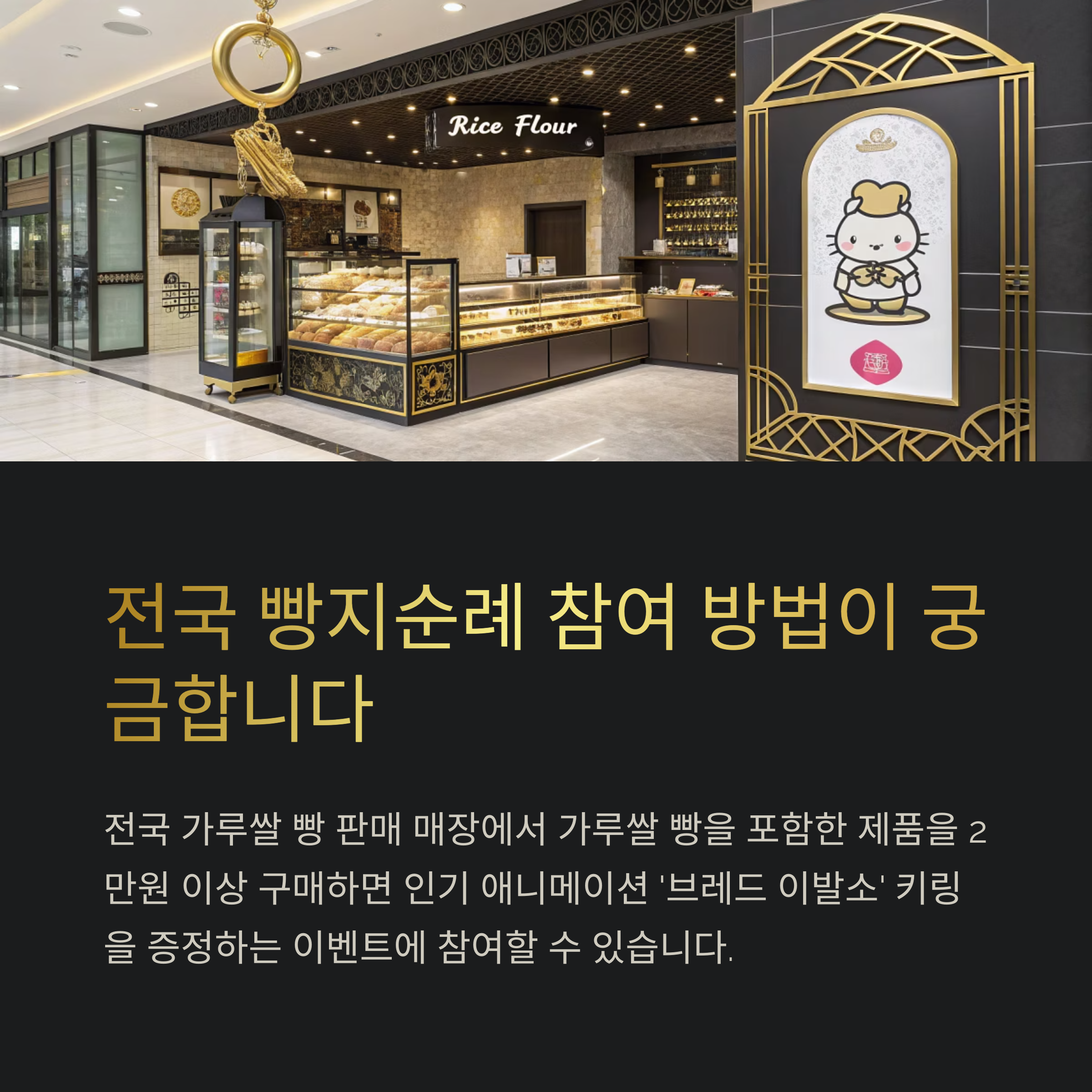 - ‘2025 가루쌀 빵지순례’ 소비자 참여 이벤트: 전국 가루쌀 빵 판매 매장에서 가루쌀 빵 포함 2만원 이상 구매 시 ‘브레드 이발소’ 키링을 증정합니다.