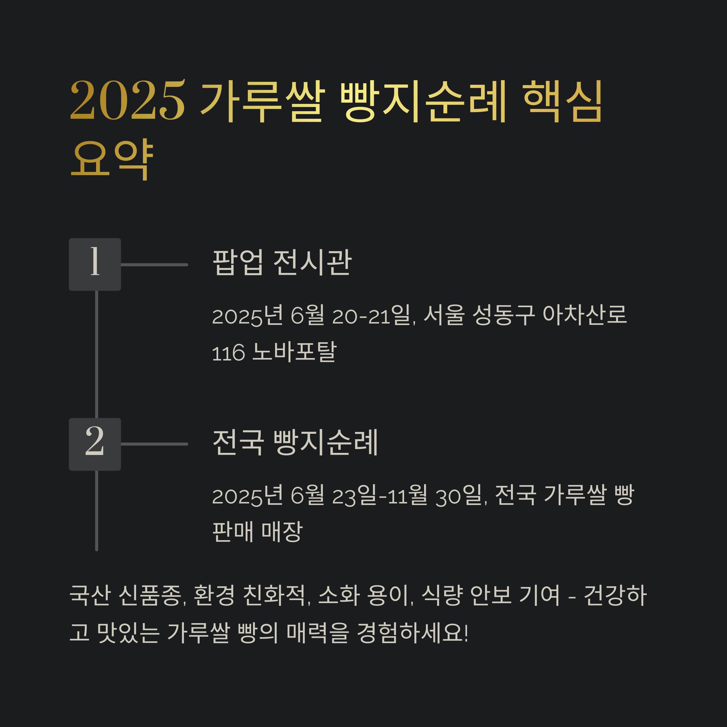 팝업 전시관 외에, 소비자 참여 이벤트인 ‘2025 가루쌀 빵지순례’는 2025년 6월 23일부터 11월 30일까지 전국 가루쌀 빵 판매 매장에서 진행됩니다. 기간이 길기 때문에 원하는 시기에 맞춰 여유롭게 방문할 수 있습니다.