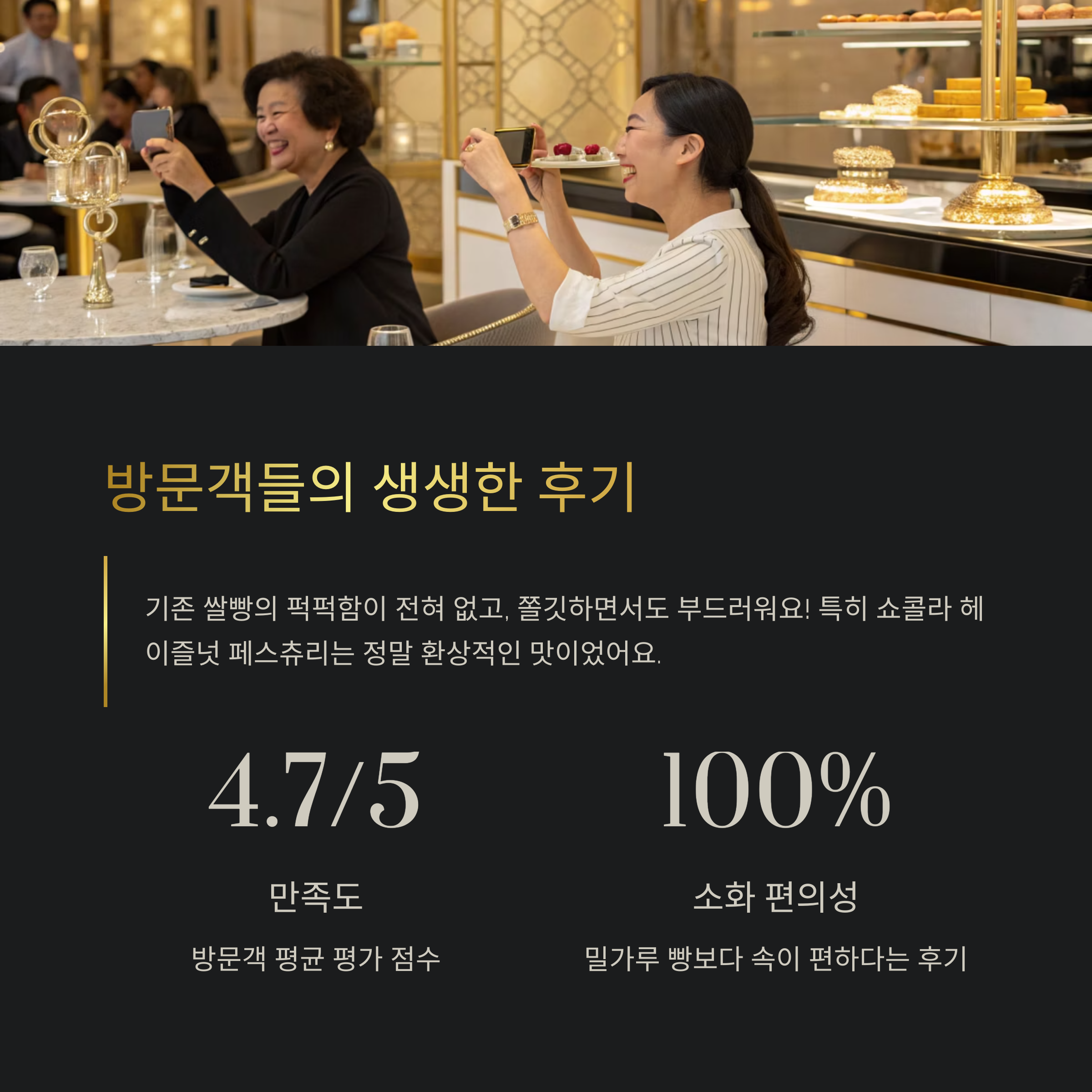 ‘가루쌀 빵지순례’에 참여했던 방문객들의 후기를 살펴보면, 가루쌀 빵의 뛰어난 맛과 건강상의 이점에 대한 긍정적인 반응이 지배적입니다. 특히 밀가루 빵보다 소화가 편하다는 후기가 많았으며, 다양한 신제품에 대한 호기심과 만족도가 높았습니다. 인스타그램 등 SNS에서는 #가루쌀빵, #빵지순례, #성수동맛집, #건강빵 등의 해시태그와 함께 수많은 시식 후기와 방문 인증샷이 공유되고 있습니다. 전반적인 만족도는 5점 만점에 4.7점에 달할 정도로 매우 높게 평가되고 있습니다.